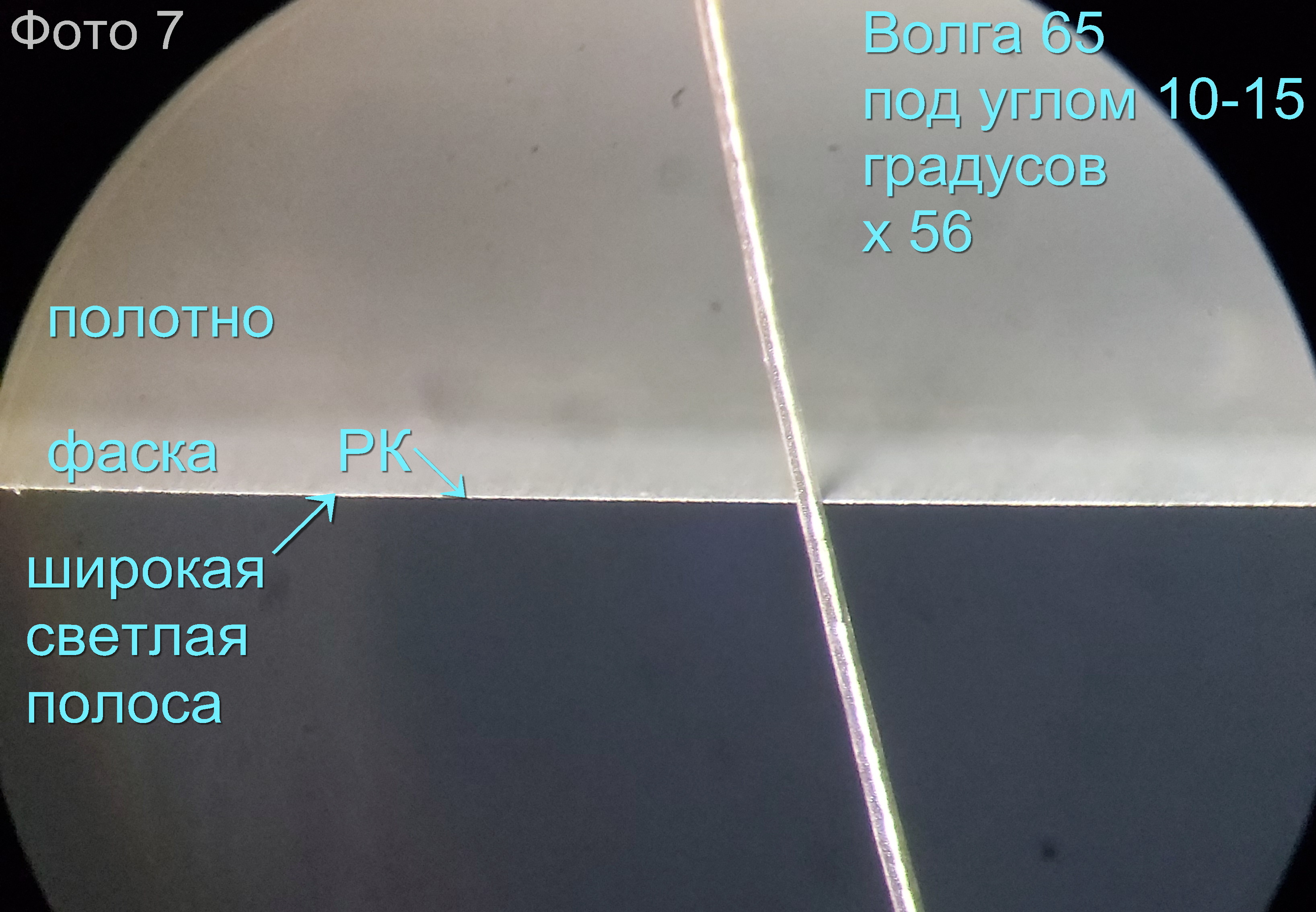 Введение Начну с вопроса надо ли пользоваться микроскопом. Этот вопрос можно перефразировать, например,: - Хотите увидеть что происходит с РК во время заточки?; - Хотите увидеть как изменяется РК после бритья, после правки на ремне и т. д. и т. п.? Эти вопросы наверное не волнуют вас, но есть один важный вопрос, который сильно волнует всех заточников без изключения. Это вопрос: Удалось ли хорошо заточить бритву? На этом вопросе ответ получается во время бритья, но сразу возникает другой самый важный и иногда бессонный вопрос: Можно ли заточить бритву еще лучше, то есть добился ли я максимума в заточке данной бритвы? Получить ответ на этого самого важного вопроса можно только с помощью микроскопа. С уважением скажу, что уверенных опытных заточников не волнуют никаких вопросов. Они говорят что хорошо справляются без микроскопа и свято верят, что у них всегда получается лучшая заточка и именно поэтому им иногда приходится обяснять, что и на старуху бывает проруха. А вот для неопытного заточника применение микроскопа принесет большую пользу, потому что он увидит что делает во время заточки и более того, он может изменить условия работы, чтобы добиться лучшего результата. В качестве аргумента, что очень полезно пользоваться микроскопом, я процитирую японского мастера заточки Касуке Ивасаки 1963 г. Перевод с японского языка на английский выполнен Джимом Районом в 2011 году: „…Парикмахеры нашли, что новые микроскопы, и так же новое оборудование, такое как УФ стерилизатор для полотенец крайне необходимы. Металлургический микроскоп, для осмотра режущей кромки бритвы, теперь доступен всем парикмахерам, когда раньше был доступен ученым. Без микроскопа ваши шансы хорошо заточить бритву будут низкие. Как вы сможете хорошо заточить режущую кромку, если вы её не видите?” Источник: сайт „Заточи Клинок”. Для просмотра опасной бритвы надо использовать микроскоп, на котором объект просматривается под отраженным светом (когда свет падает сверху или со стороны), например МБС-1, МБС-2, МБС-9 или МБС-10. Забудьте про китайских USB-микроскопов. Они не годятся, не только из за плохое качество оптики и выдуманное увеличение. У них из за множество источников, свет рассеянный, что мешает ясно увидеть то что нужно. Свет должен выходить из одного источника и лучи его должны быть параллельными. В качестве источника света кроме осветителя микроскопа МБС, можно использовать фонарик с одним светодиодом - я так делаю. Первая часть В качестве объектов будут выступать опасные бритвы Волга 65 и Puma 39. Все фото сделани с 56-кратным увеличением и для лучшего восприятия масштаба на них будет присутствувать седой волос с моей „светлой” головы. Надеюсь, что все фотографии будут смотреться ясно. Итак, первый способ просмотра опасной бритвы под микроскопом – это просмотр под углом около 90 градусов к объективу. Свет идет спереди и под углом около 45 градусов к горизонтали. (ФОТО 1) На ФОТО 2 показана бритва Волга 65 после доводки на Гуанси. Хорошо видна поверхность полотна, фаска бритвы и РК. При просмотре под углом около 90 градусов на фаску можно увидеть риски и следов абразивных частиц, а на РК, если таковы имеются, выкрошенные участки, сколы, большие замины и загибы. Это очень полезно, но при таком способе просмотра нельзя увидеть остроту РК! На ФОТО 3 аналогичным образом показана бритва Pum