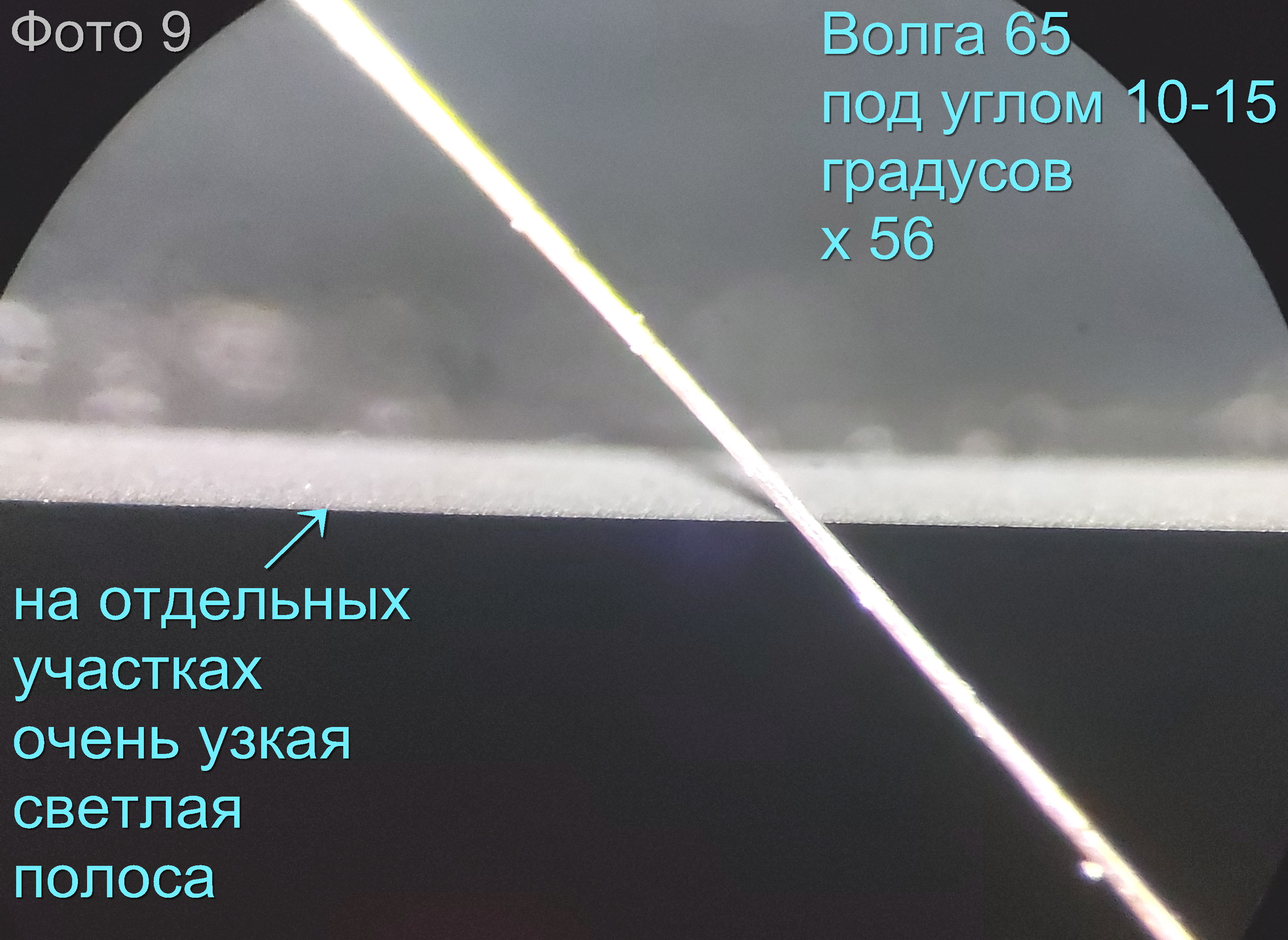 Второй способ просмотра опасной бритвы под микроскопом – это просмотр под углом около 10-15 градусов к объективу. Свет идет спереди и под углом около 45 градусов к горизонтали. (ФОТО 6) Таким способом мы можем увидеть остроту РК. Я постараюсь объективно показать как выглядит РК опасной бритвы Волга 65 в динамики заточного процесса, бритья и правки на подвесном ремне. На ФОТО 7 показана бритва Волга 65 после плохой доводки на Гуанси. В данном случае РК имеет большой радиус скругления (она тупая), поэтому она отражает свет в виде широкой светлой полосы. На ФОТО 8 показана бритва Волга 65 после хорошей доводки на Гуанси. В данном случае РК имеет маленький радиус скругления (она острая), поэтому она отражает свет в виде узкой светлой полосы. РК острая. На ФОТО 9 показана бритва Волга 65 после правки на чистом подвесном ремне. Радиус скругления РК стал очень маленький (она очень острая), в результате чего она почти не отражает свет. На отдельных участках РК слабо видна очень узкая светлая полоса. РК очень острая. На ФОТО 10 показана бритва Волга 65 после первого бритья. На РК появилось множество замин - признаки затупления, вследствие чего, РК отражает свет в виде широкой прерванной светлой полосы. РК затупилась. На ФОТО 11 показана бритва Волга 65 после правки на чистом подвесном ремне. Видно что заминов нет, на отдельных участках РК выстроилась в струнку вследствие чего отражает свет в виде очень узкой прерванной светлой полосы. РК опять острая. На ФОТО 12 показана бритва Волга 65 после второго бритья. На РК опять появилось множество замин - признаки затупления, вследствие чего РК отражает свет в виде широкой прерванной светлой полосы. РК затупилась. На ФОТО 13 показана бритва Волга 65 после правки на чистом подвесном ремне. Заминов нет. РК полностью выстроилась в струнку, вследствие чего отражает свет в виде очень узкой светлой полосы. РК опять острая. После ежедневного бритья в течение 5 дней, наблюдения показали, что в дальнейшем РК бритвы Волга 65 после очередного бритья будет переходить в состояние на ФОТО 12, а после правки на чистом ремне возвращатся в состояние на Фото 13. Если быстро переключат фотографии, динамика изменения РК прослеживается лучше.