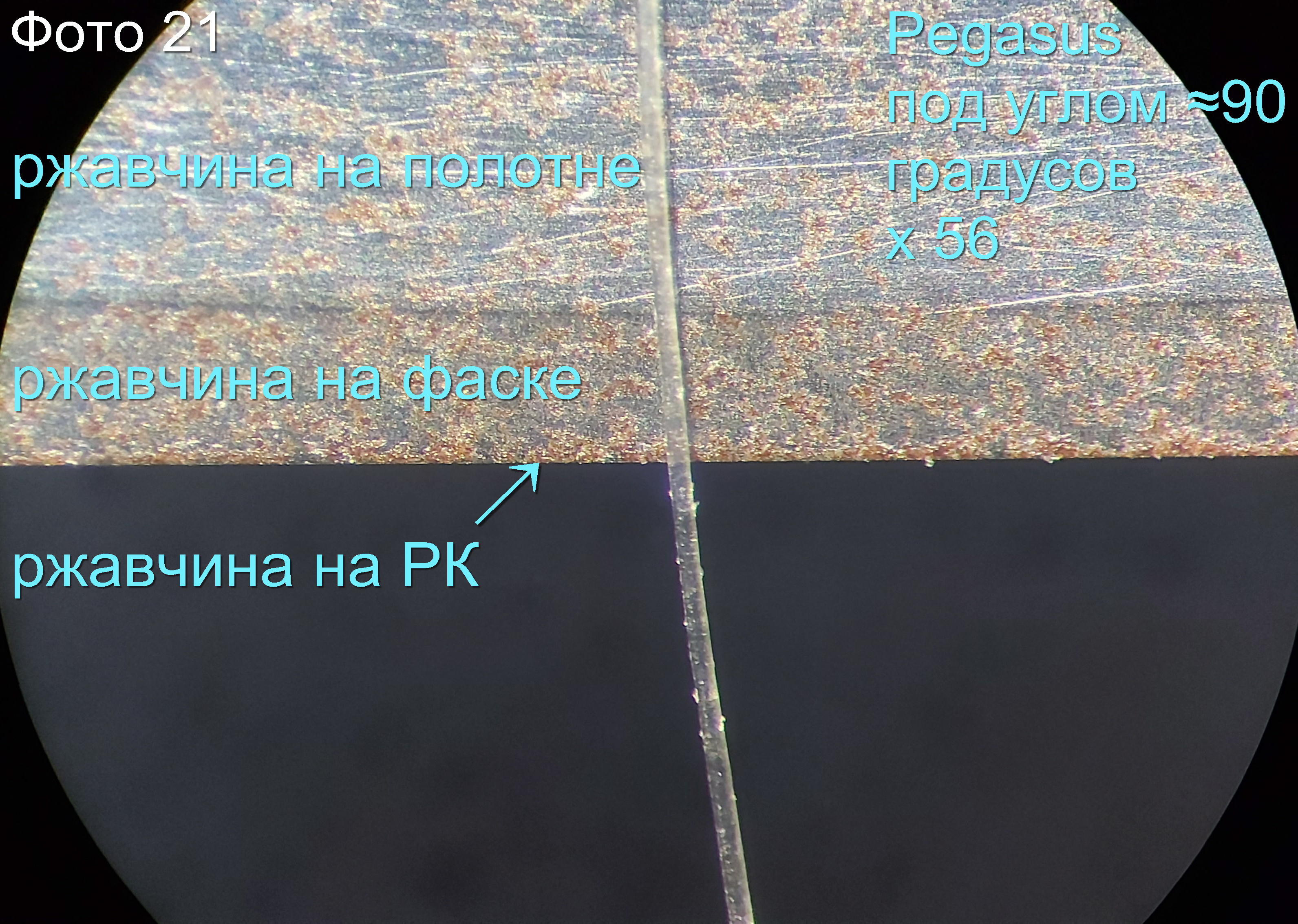 Я рассмотрю и покажу что произходит с РК, когда бритва начинает ржаветь. Вначале я хочу объяснить, что применяемый по отношению к РК термин радиус скругления не является специфичным ножевым термином, как, наверное, думают некоторые. Этот термин происходит от диаметр окружности, вписанной в профиль острия. Об этом писал А. Б. Герчиков в „КАК БРИТВА”. Я процитирую его слова: „Показателем остроты принято считать диаметр окружности, вписанной в профиль острия”: viewtopic.php?p=1319#p1319 И так, более полутора месяца я хранил в жилую комнату несколько заточенных бритв (рабочие лошадки), в пластиковой коробке с приоткрытой крышкой. Бритвы не обрабатывал маслом или другим средством для защиты от ржавчины. И вдруг меня дёрнуло, я рассмотрел их и обнаружил на одной из них (Pegasus), на переднем крае полотна малозаметное пятно. Оно как легкая туманность и его трудно сфотографировать. Конечно, мне хотелось думать, что пострадало только полотно, а РК осталась нетронутой и решил посмотреть под микроскопом. Свет идет спереди и под углом около 45 градусов к горизонтали. Вот на Фото 21 и Фото 22 увидел ржавчину во всей красе: Все таки, я сохранил надежду и что бы убрать ржавчину и увидеть истинное состояние РК, решил править бритву на ремне. Но чтобы не запачкать своего хорошего ремня, я правил на хорошо отшлифованном брючном, которого я использовал для этой цели много лет назад. Вот Фото 23 под углом около 90 градусов, после правки. Оно очень информативное. Ржавчина ушла с фасок и РК и стало видно, что она „съела” целые куски с РК и там ямки! РК представляет собой не прямую, а волнообразную линию. Короче говоря на жаргоне, ппц РК! Так как пятно находится в передней части бритвы, ржавчины захватила и уничтожила всю первую половину РК. На Фото 24 под углом 10-15 градусов видно, что жалкие остатки РК имеют большой радиус скругления и поэтому отражают свет в виде широкой прерванной светлой полосы. То есть, РК сильно затупилась. А там где РК не блестит - там ржавчина „съела” куски с нее, в результате чего образовались ямки. Если учитывать, что кроме сильного затупления, ржавчина сделала ямки на РК, вывод совершенно ясен и однозначен – бритву придется затачивать сного. Такие вот дела. Самое интересное в том, что в данном конкретном случае, наблюдения показали, что не получилось так, чтобы полотно легко пострадало от ржавчины, а РК сохранилась без поражений. Все очень непросто. В прошлом я не раз наблюдал под микроскопом, что ржавые пятна с четкими краями от водных капель на полотне существували на бритвах с незатронутой РК. Так что, к счастью, не каждое ржавое пятно на бритве означает, что РК уничтожена. ИМХО самыми опасными являются мгливые, туманные пятна, которые указывают что ржавчина начинает распространяться равномерно во всех направлениях от первоначального очага. Надеюсь, было интересно. С 2013 г. с кайфом бреюсь опасной бритвой пять раз в неделю, в три прохода.