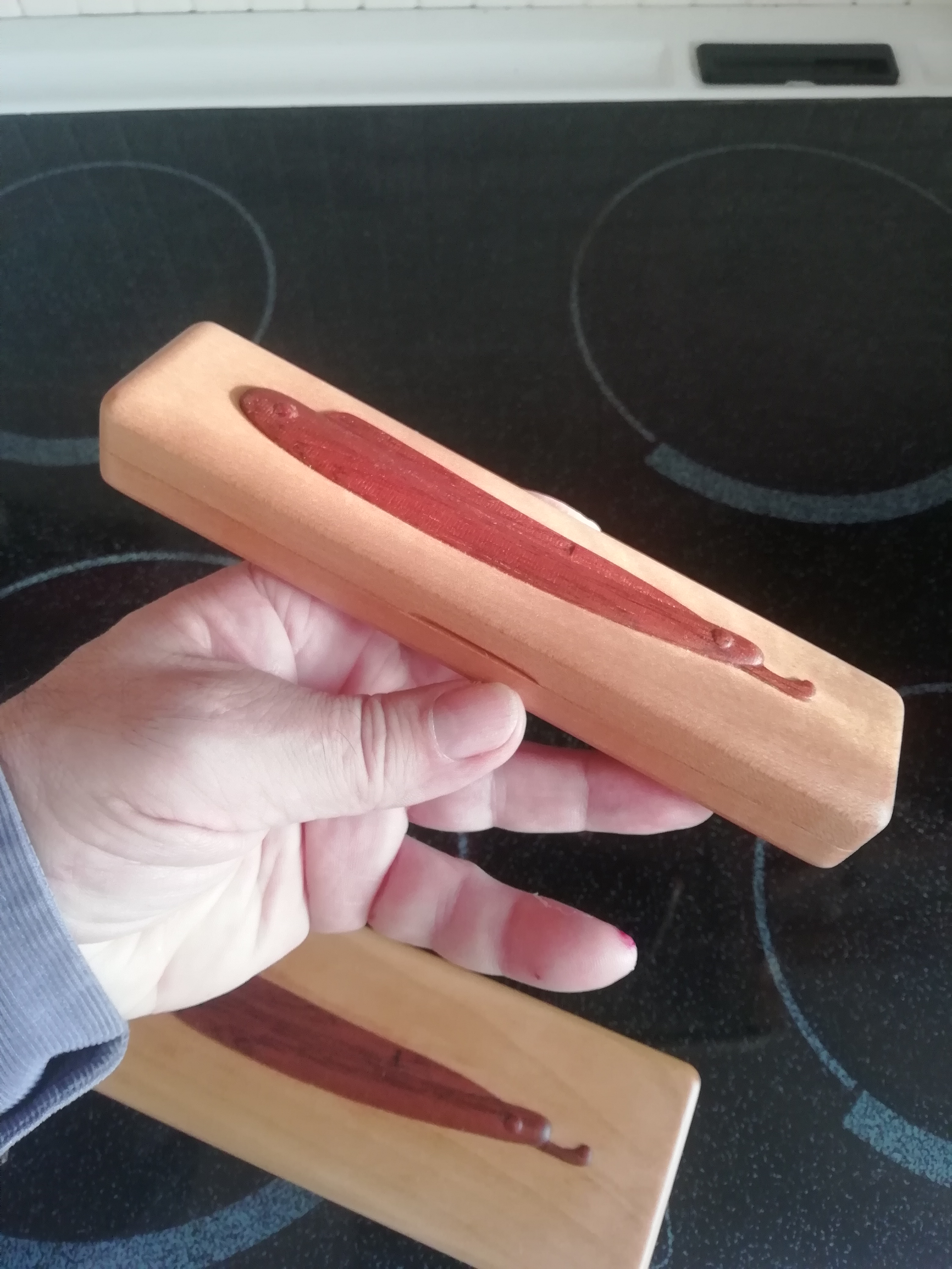 Футляр для опасной бритвыКлен и вишня. Походный футляр на 2 бритвы и на 1 бритву, с интарсией бритв из сапели в крышках. Гарнитур. Вкладыш из бука, но цвет гармонирует.