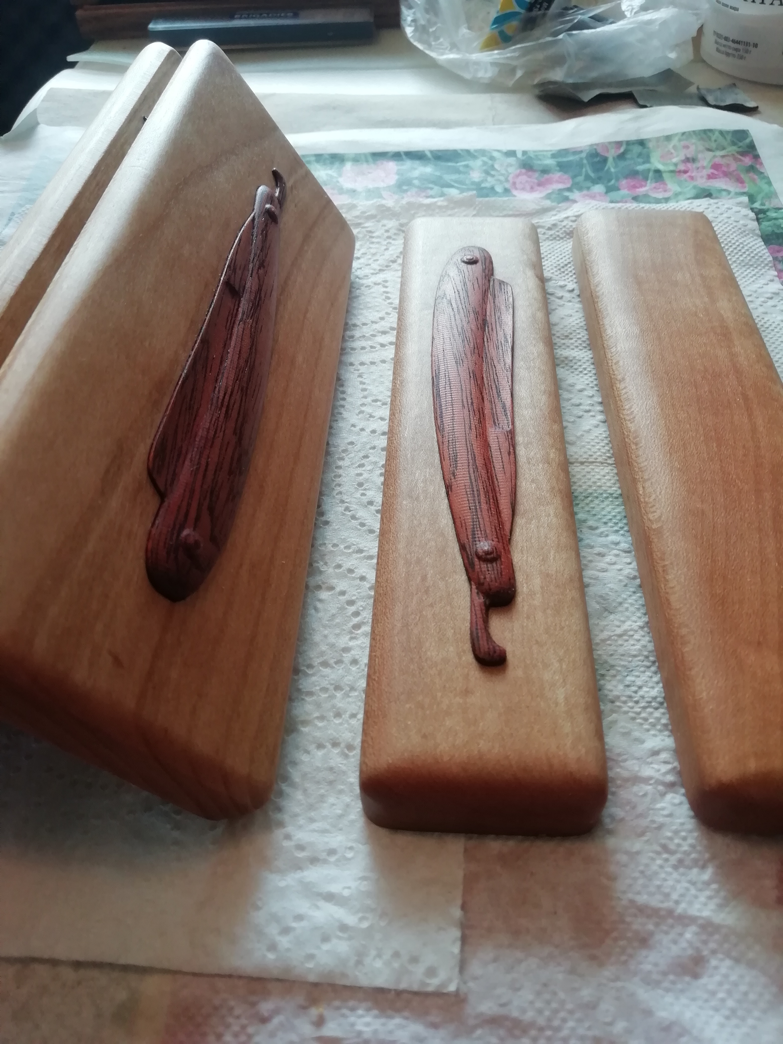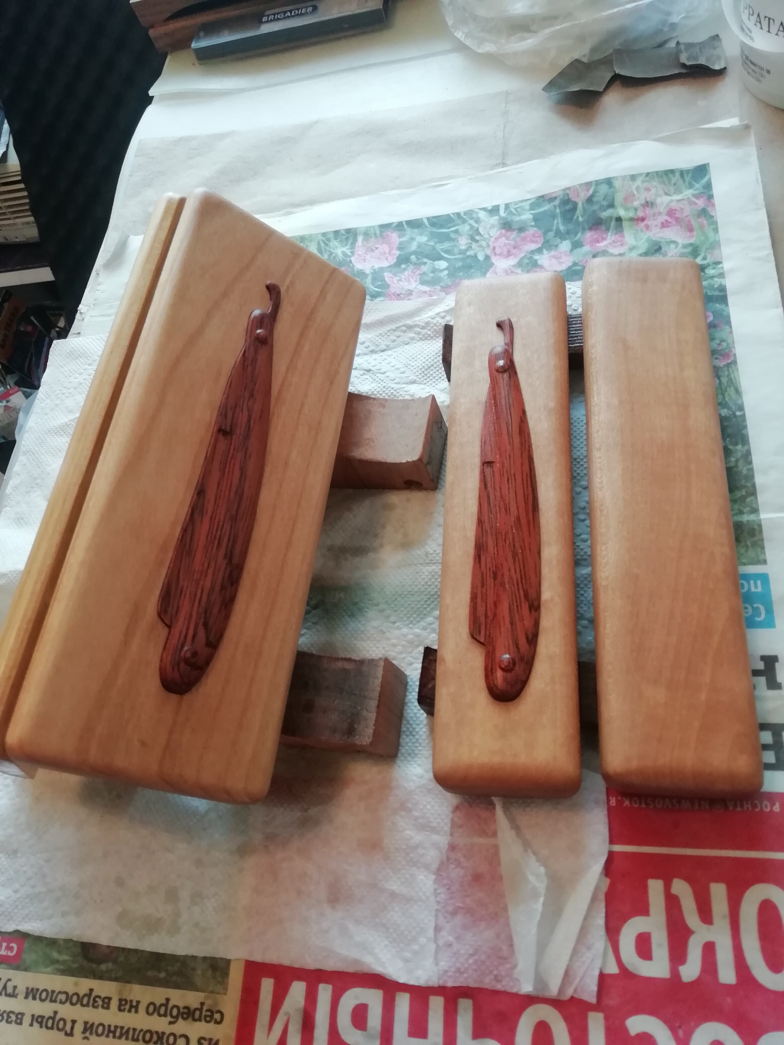 Футляр для опасной бритвыКлен и вишня. Походный футляр на 2 бритвы и на 1 бритву, с интарсией бритв из сапели в крышках. Гарнитур. Вкладыш из бука, но цвет гармонирует.