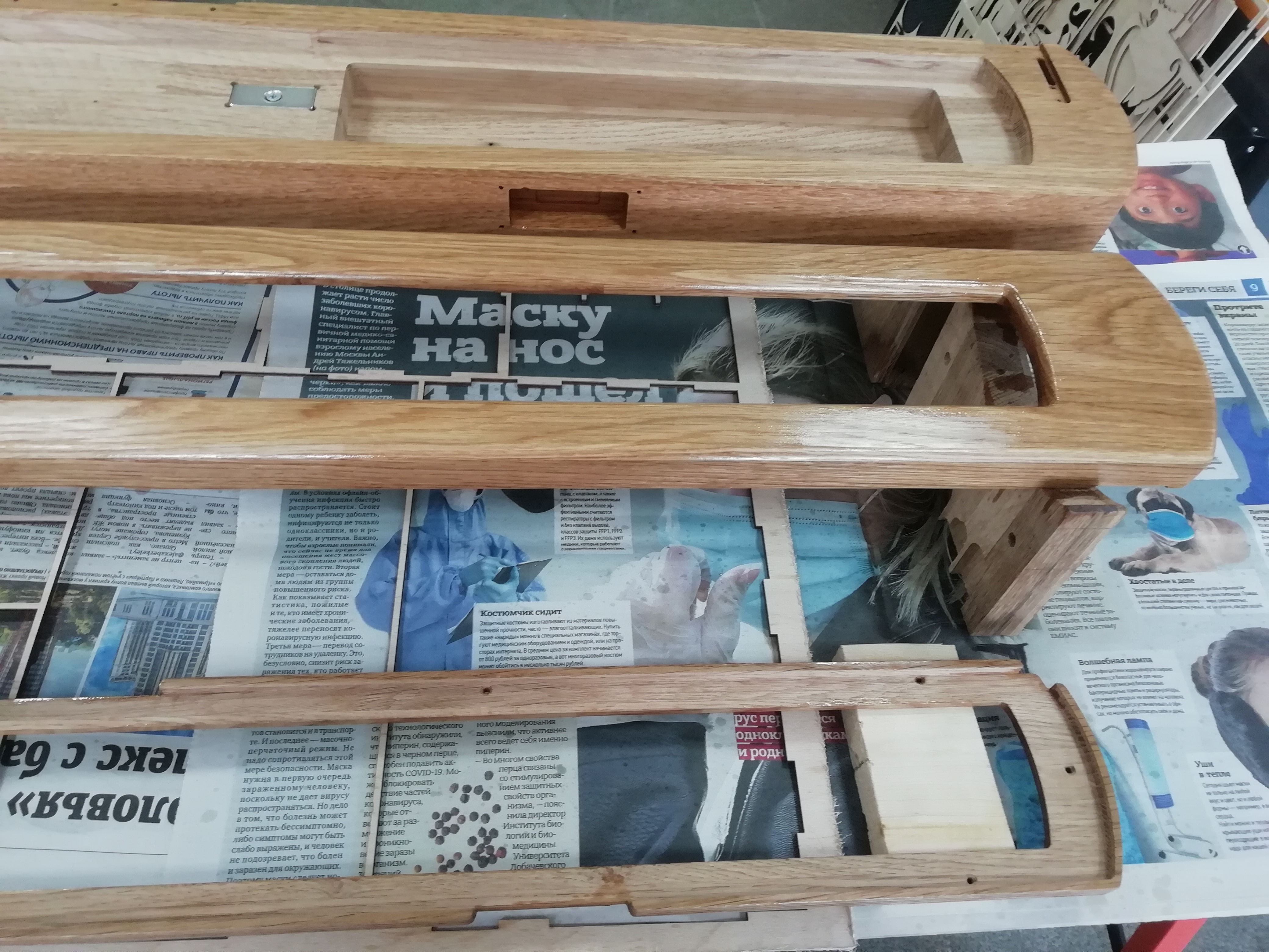 Дуб, фетр, петли, магниты, масло, воск. Дуб - фрезер ЧПУ. Фетр - лазер ЧПУ. Шкурки до F1000. Как всегда - допуски тут 10...50мкм по дереву и 1 десятка по фетру. От заложенных по проекту. Аксессуары сидят "как влитые" при закрытой крышке футляра и не стукают внутри, если трясти. (есть даже видеоотзыв камрада, заказавшего и получившего этот футляр, но не знаю, там, наверное, больше личное, в общем - ему понравилось)