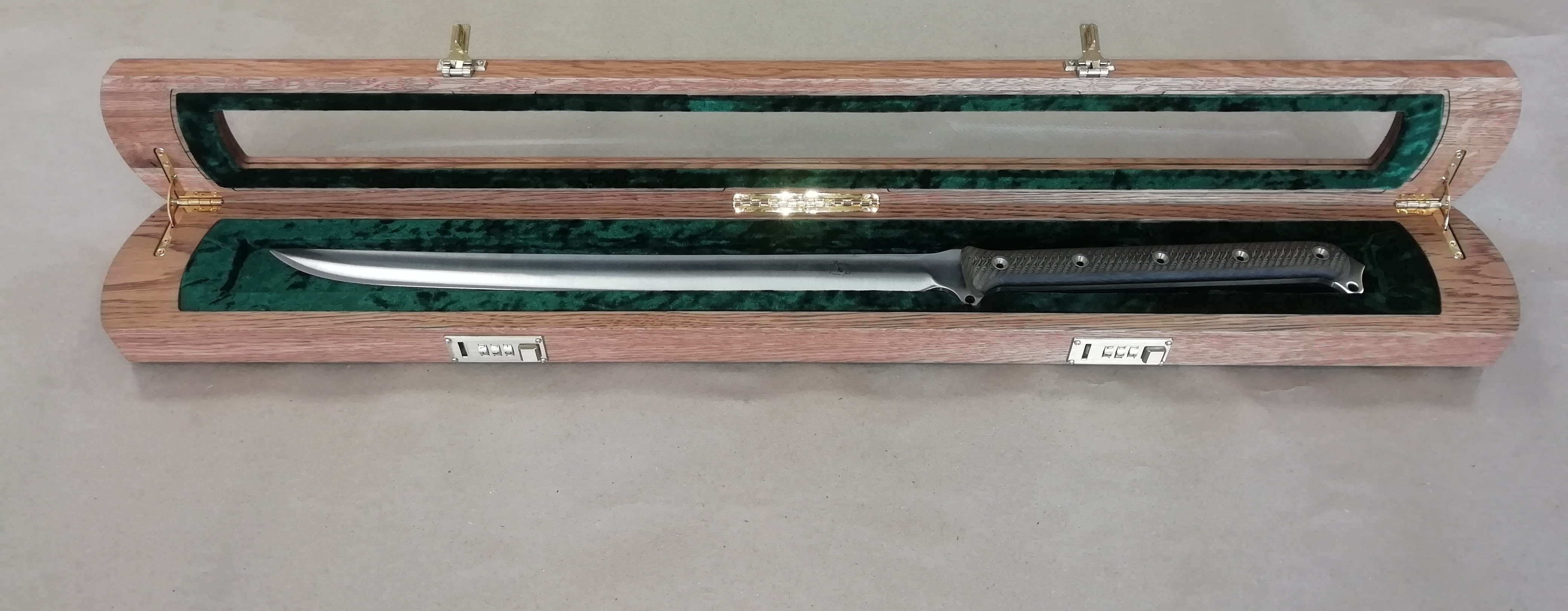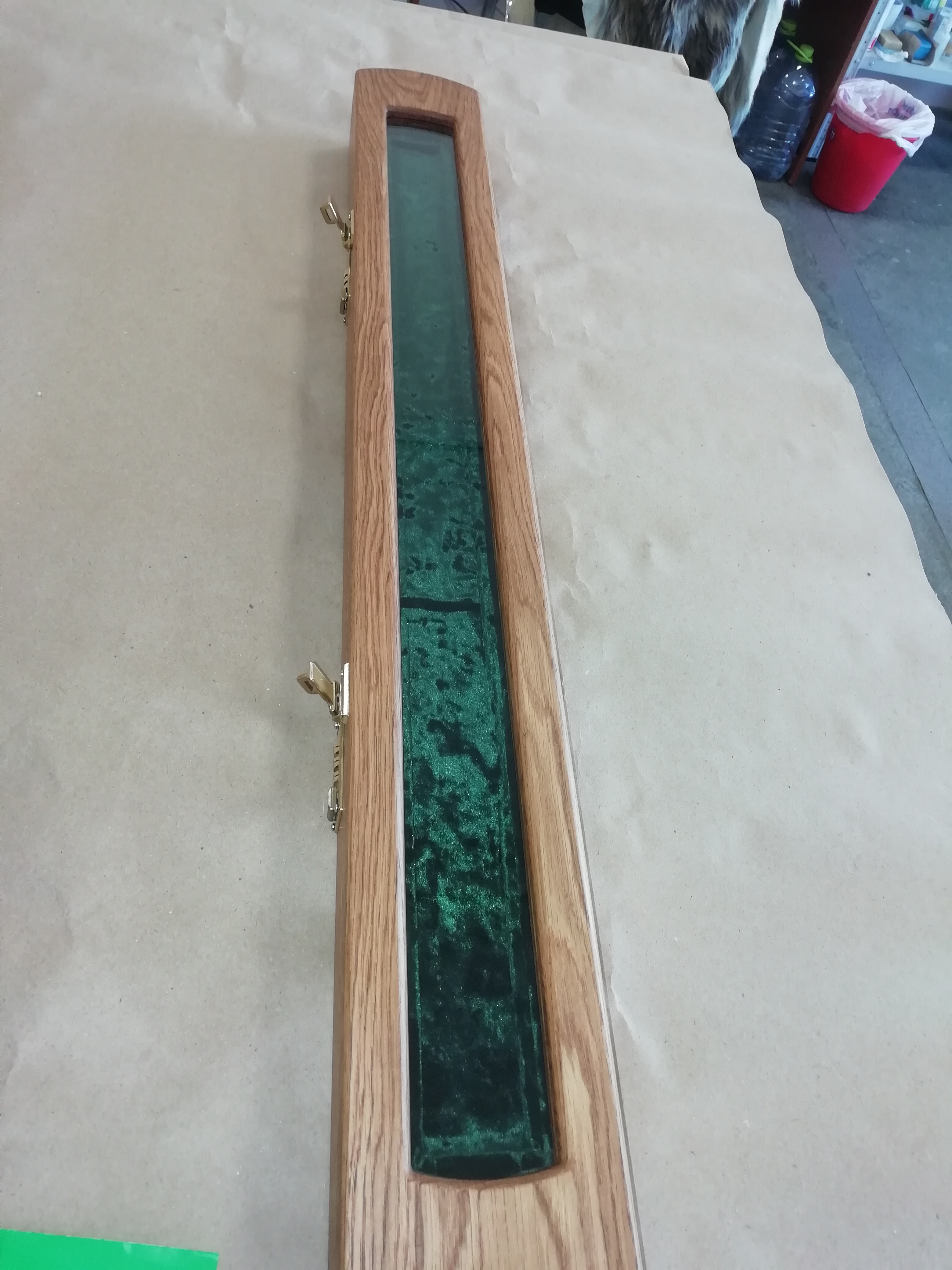 Ну вот футлярчик для не совсем бритвы, но тоже острая вещь - для Busse Combat American Kensei 47 (AK-47) Wakizashi, 2005. Явное ХО. Азотировано-ванадиевая сталь INFI (клинок сгибается вбок до 35 град без повреждений, при 58...60HRC!), длина шашечки\сабельки\ножичка - 29" (74см, ну прям длинная для меня). В общем это один из шедевров УСАшных ножеделов от уважаемого производителя. И потому, как я понимаю, это чистый вечный полочник. Потому и футлярчик делал очень внимательно, старался, чтоб он коррелировал с помещаемым внутрь предметом. Материал - дуб склейка с покрывными ламелями - 40мм толщины. 920 х 110 х 69 мм - габариты футляра. ТикОйл, Воск затемнённый Либерон, китайская и итальянская латунная фурнитура, зелёный бархат, поролон ППЭ, ППУ, стекло - акрил (Плексиглас), неодимовые магниты, фетр. Общий вес футлярки около 5...6кг, если с ножиком, в общем тяжёлый, как камрад захотел. Сабелька держится внутри футляра на 3х прямоугольных магнитиках, при их общем усилии около 10кг. (или более), что позволяет, в том числе, переносить футляр с зафиксированной ими шашкой-вакидзашкой внутри (и даже трясти футляр). Футляр стоит на 5 ножках 7х16х50 R6 мм, которые врезал на 3 мм в выборки корпуса, снизу ножек - фетр. Выношу на ваш суд, соответствует ли исполнение задаче (любое мнение интересно)?