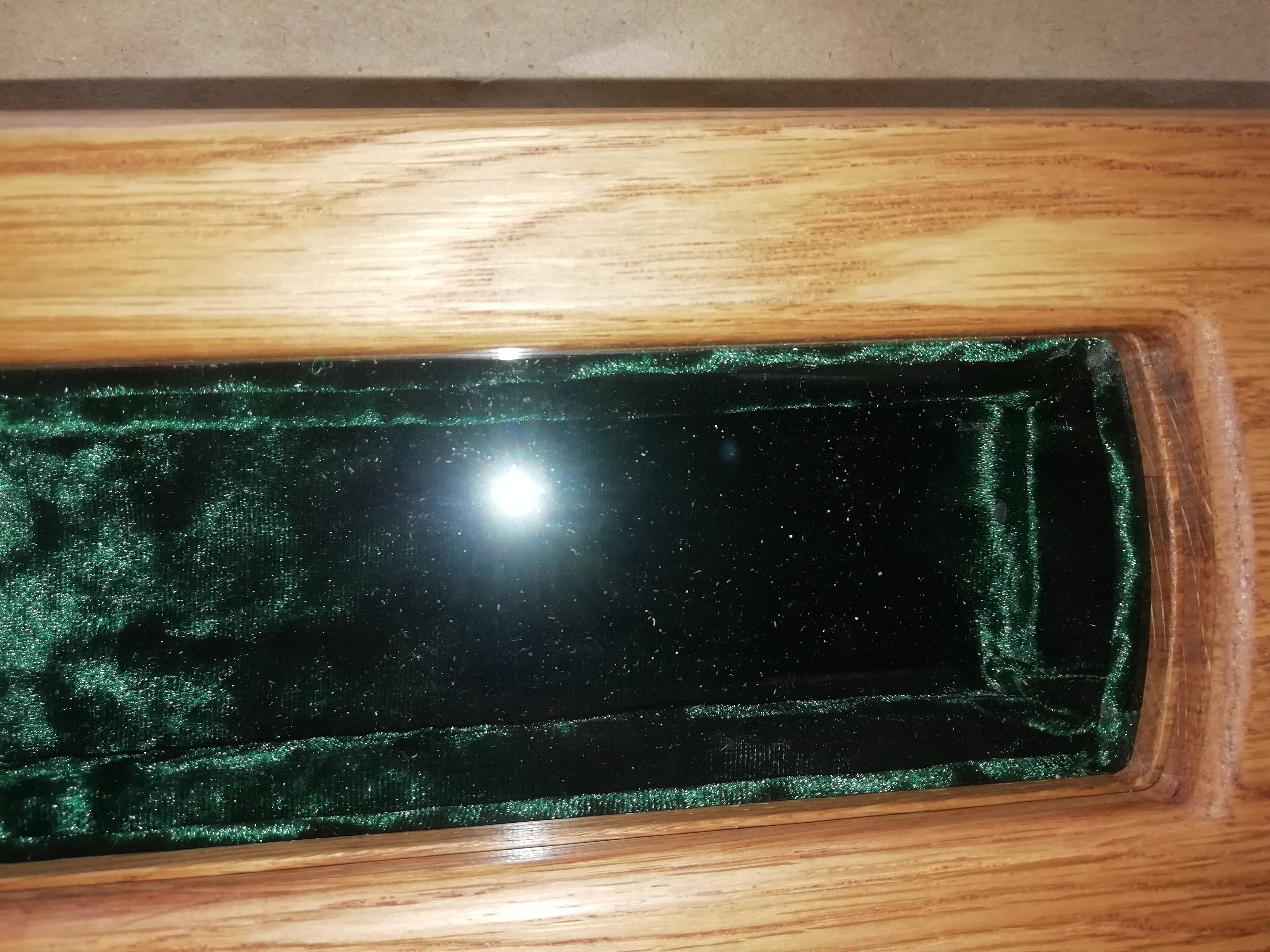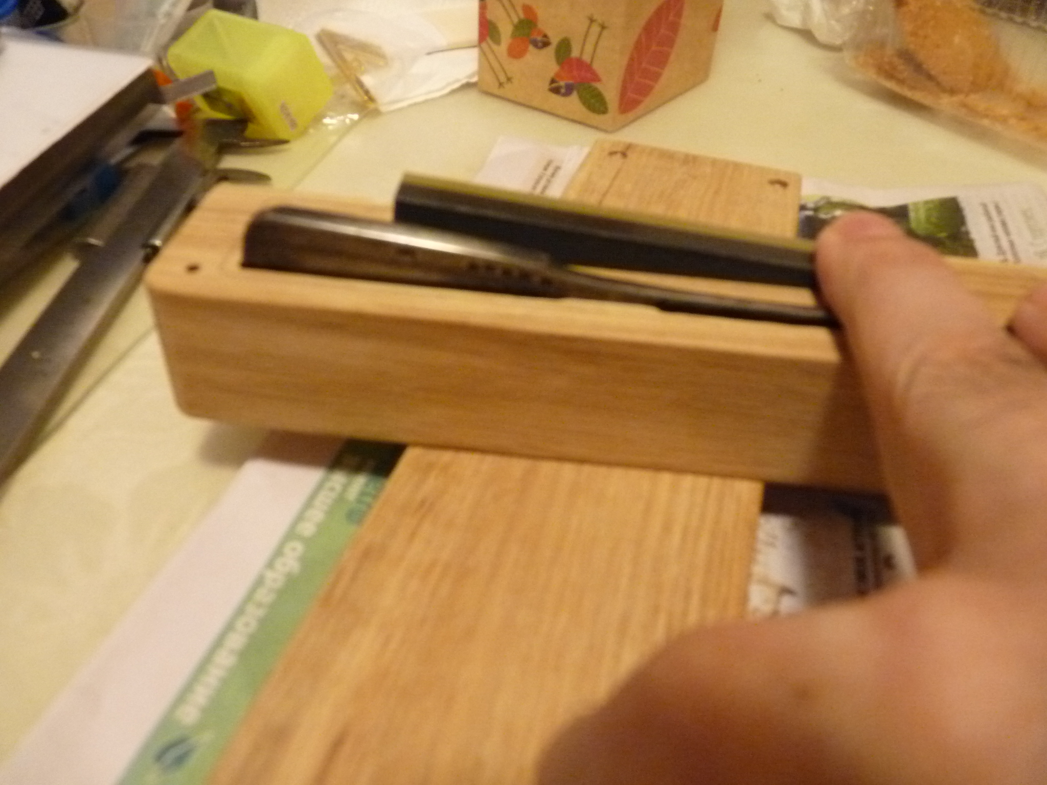 Ну вот футлярчик для не совсем бритвы, но тоже острая вещь - для Busse Combat American Kensei 47 (AK-47) Wakizashi, 2005. Явное ХО. Азотировано-ванадиевая сталь INFI (клинок сгибается вбок до 35 град без повреждений, при 58...60HRC!), длина шашечки\сабельки\ножичка - 29" (74см, ну прям длинная для меня). В общем это один из шедевров УСАшных ножеделов от уважаемого производителя. И потому, как я понимаю, это чистый вечный полочник. Потому и футлярчик делал очень внимательно, старался, чтоб он коррелировал с помещаемым внутрь предметом. Материал - дуб склейка с покрывными ламелями - 40мм толщины. 920 х 110 х 69 мм - габариты футляра. ТикОйл, Воск затемнённый Либерон, китайская и итальянская латунная фурнитура, зелёный бархат, поролон ППЭ, ППУ, стекло - акрил (Плексиглас), неодимовые магниты, фетр. Общий вес футлярки около 5...6кг, если с ножиком, в общем тяжёлый, как камрад захотел. Сабелька держится внутри футляра на 3х прямоугольных магнитиках, при их общем усилии около 10кг. (или более), что позволяет, в том числе, переносить футляр с зафиксированной ими шашкой-вакидзашкой внутри (и даже трясти футляр). Футляр стоит на 5 ножках 7х16х50 R6 мм, которые врезал на 3 мм в выборки корпуса, снизу ножек - фетр. Выношу на ваш суд, соответствует ли исполнение задаче (любое мнение интересно)?