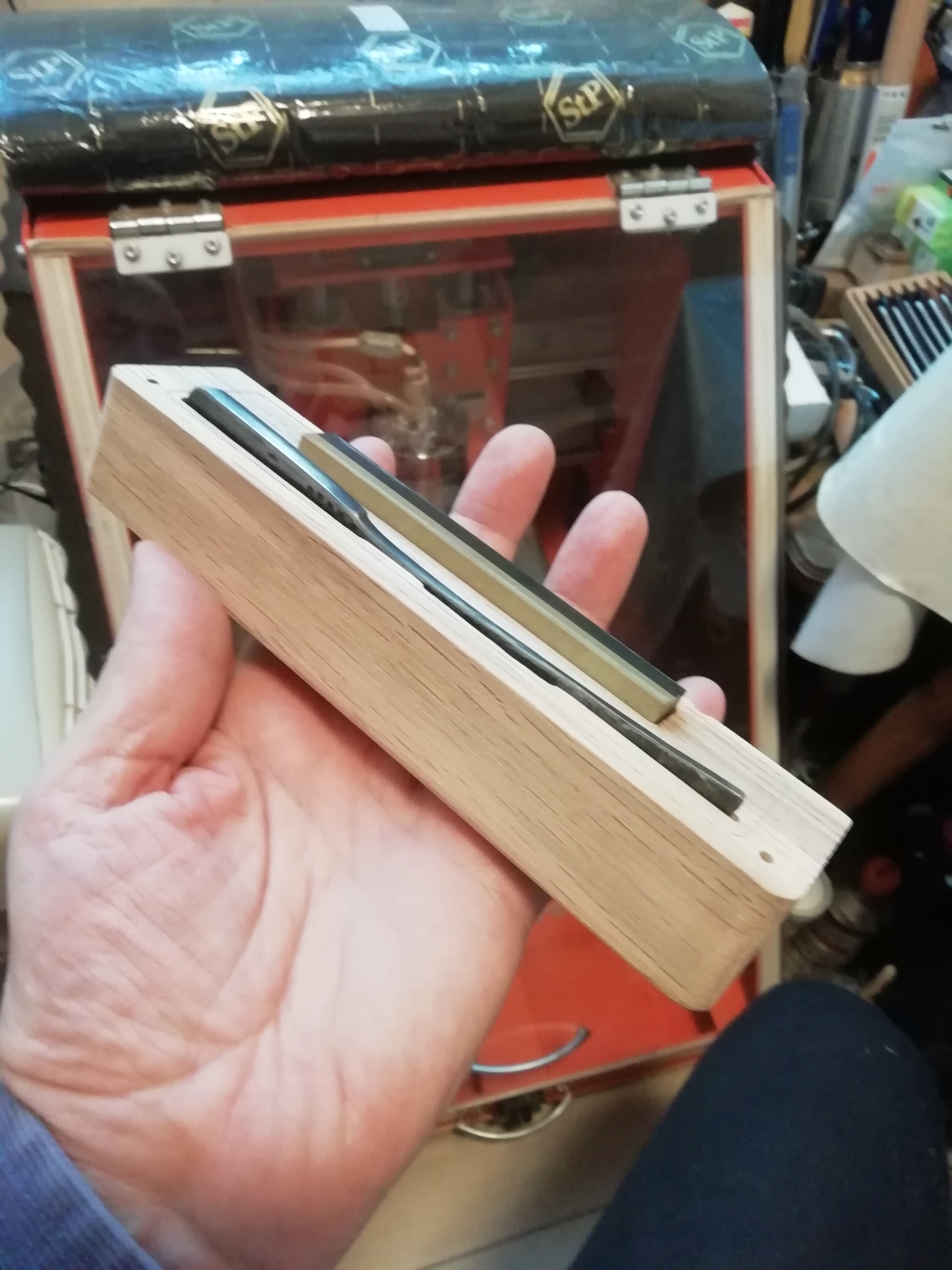 Ну вот футлярчик для не совсем бритвы, но тоже острая вещь - для Busse Combat American Kensei 47 (AK-47) Wakizashi, 2005. Явное ХО. Азотировано-ванадиевая сталь INFI (клинок сгибается вбок до 35 град без повреждений, при 58...60HRC!), длина шашечки\сабельки\ножичка - 29" (74см, ну прям длинная для меня). В общем это один из шедевров УСАшных ножеделов от уважаемого производителя. И потому, как я понимаю, это чистый вечный полочник. Потому и футлярчик делал очень внимательно, старался, чтоб он коррелировал с помещаемым внутрь предметом. Материал - дуб склейка с покрывными ламелями - 40мм толщины. 920 х 110 х 69 мм - габариты футляра. ТикОйл, Воск затемнённый Либерон, китайская и итальянская латунная фурнитура, зелёный бархат, поролон ППЭ, ППУ, стекло - акрил (Плексиглас), неодимовые магниты, фетр. Общий вес футлярки около 5...6кг, если с ножиком, в общем тяжёлый, как камрад захотел. Сабелька держится внутри футляра на 3х прямоугольных магнитиках, при их общем усилии около 10кг. (или более), что позволяет, в том числе, переносить футляр с зафиксированной ими шашкой-вакидзашкой внутри (и даже трясти футляр). Футляр стоит на 5 ножках 7х16х50 R6 мм, которые врезал на 3 мм в выборки корпуса, снизу ножек - фетр. Выношу на ваш суд, соответствует ли исполнение задаче (любое мнение интересно)?