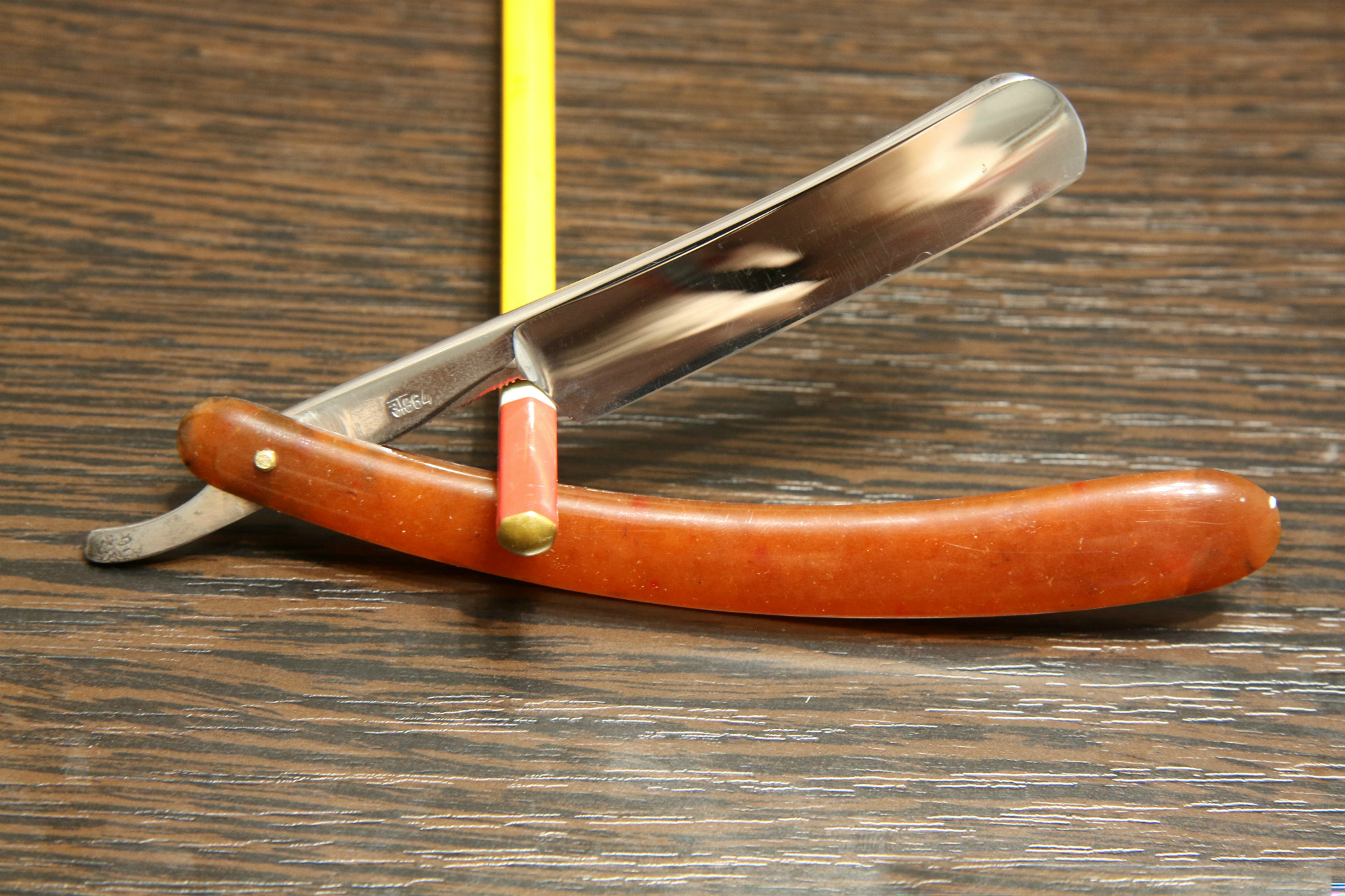 Опасная бритва Dovo Best Quality Solingen, сделана в Германии в г. Золинген, ширина полотна 20.3 мм, ручка трехпиновая из желтоватого пластика, все родное. Ко мне попала с заводской заточкой и без каких либо следов, с гравюрой. Продезинфицировал и подготовил к бритью. Широкая и удобная бритва с традиционной немецкой сталью на полной выборке. Цена - руб.