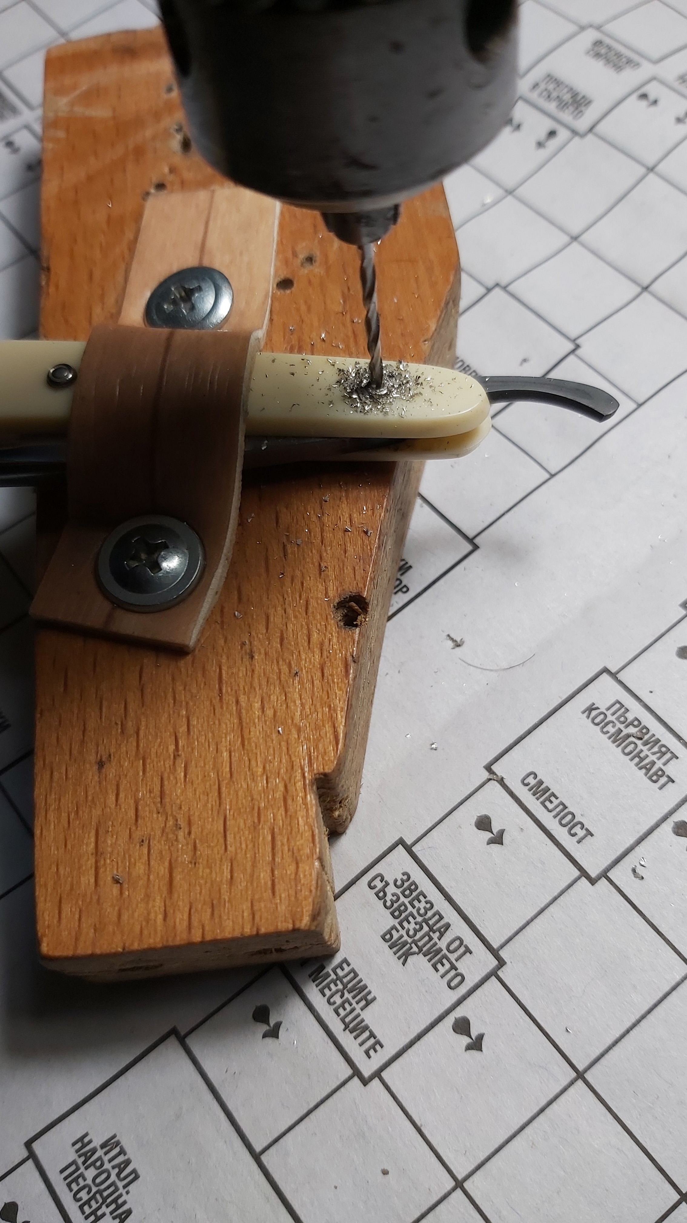 Заклёпки (пины) для бритв, установка, изготовлениеЗмей Болгариныч для высверливания пинов есть различные кондукторы. Мой последний сделан из фильеры 1,5 мм. запрессованной в кусок латуни. Фильера из ВК12 (победит) и не изнашивается во время высверливания.