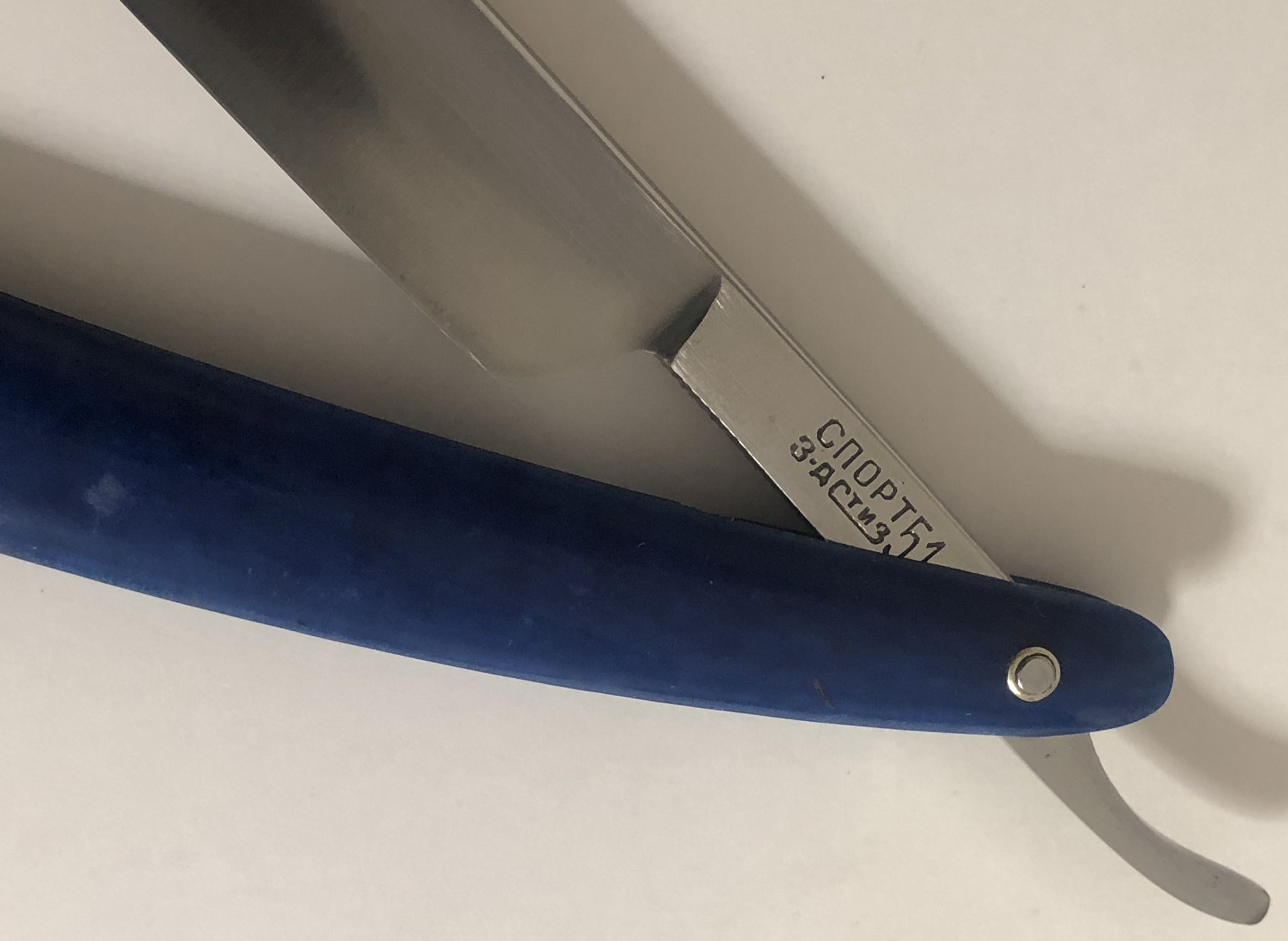 Бритва очень хорошо сохранилась, без критичных дефектов и наверное малопользованная, судя по неуточенному обушку..Была разобрана, немного почищена , отполирована и снова собрана, с сохранением родного пина. Кромочка идеально ровная.(Немного уточен носик, в результате неправильно заточки предыдущими владельцами. Но, практически незаметно и ни на что влиять не будет.)Приятная бритовка во всех отношениях. Будет удобна не только в качестве бритья, но и для коррекции усов и бороды.Не пропустите отличную вещь, за недорого, практически по цене советской.