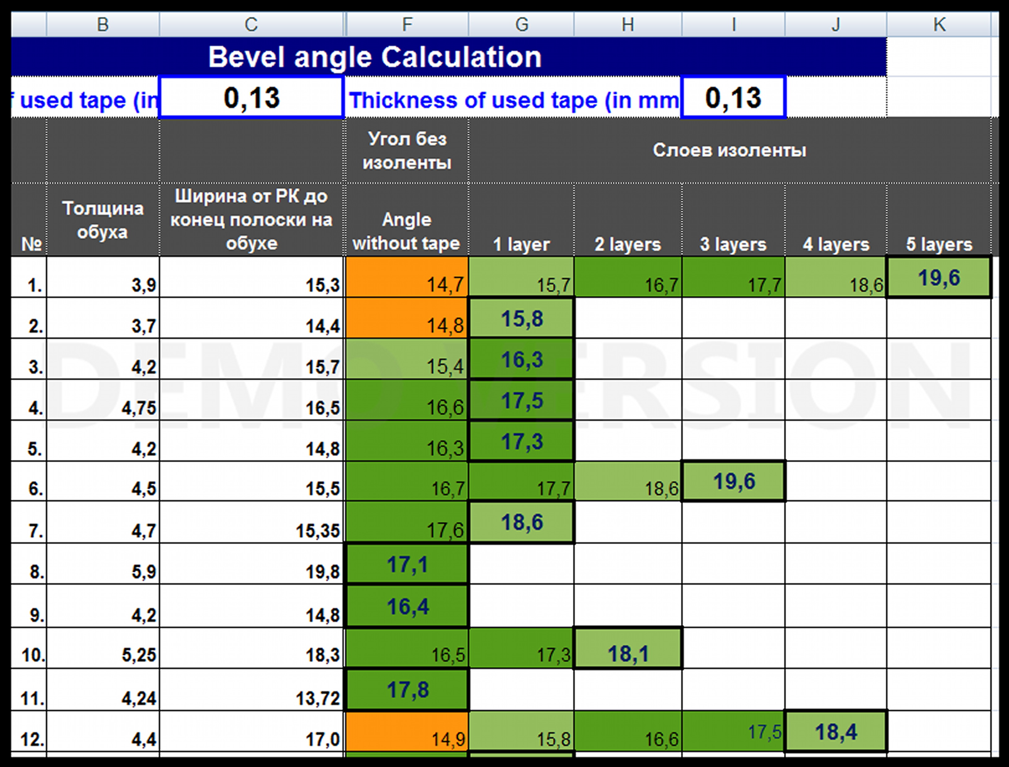 Второй способ - сделать обух потолще, вследствие чего увеличится угол режущей кромки. Обычно обух обклеивается одним или несколькими слоями изолентой. Надо отметить, что многие люди затачивают с одним слоем, чтобы не сточить фасок на обухе. Это практически не влияет на качество бритья. Я рассмотрю применение нескольких (до пяти) слоев, которые сильно меняют свойства режущей кромки удерживать заточку и комфортно брить в трех проходов. После восстановления и заточки бэушных бритв, у некоторых из них наблюдается неспособность удерживат заточку. Инными словами, у такой бритвы кромка нестойкая, она быстро затупляется во время второго прохода против волос, а иногда даже и во время первого прохода по росту волос. Про такой бритвой обычно говорят, что наверное кромка перегретая во время полировки, регринда, в прошлом грели над пламенем для стерилизации или даже что виновата плохая термическая обработка производителя. И никто не задумывается какой у этой бритвы угол режущей кромки. Мне попадались множество таких бритв и большинство из них мне удалось „вылечить” при помощи увеличения угла режущей кромки. После применения разное количество слоев изолентой мне удается подобрать такой угол заточки, чтобы определенная бритва успевала удержать заточку в течении трех проходов и при этом брить комфортно. Для вычисления углов я использовал общедоступный калькулятор угла режущей кромки на экселе. Я покажу часть табличных данных для первой дюжины своих бритв без наименований и коротко объясню про каждую. В выделенных ячейках указан окончательный угол режущей кромки бритвы. Бритвы под номерами 8,9 и 11 затачивались без изолентой и хорошо держат заточку под указанными углами. (17,1, 16,4 и 17,8 градусов). Бритвы под номерами 2,3,4,5 и 7 затачивались одним слоем изолентой без особой надобности а только чтобы беречь обух и хорошо держат заточку под указанными углами. (15,8, 16,3, 17,5, 17,3 и 18,6 градусов). Бритва под номером 10 затачивалась двумя слоями изолентой, потому что только под минимальным углом 18,1 градусов хорошо держит заточку. Бритва под номером 6 затачивалась тремя слоями изолентой, потому что только под минимальным углом 19,6 градусов хорошо держит заточку. Бритва под номером 12 затачивалась четирьмя слоями изолентой, потому что только под минимальным углом 18,4 градусов хорошо держит заточку. Бритва под номером 1 затачивалась пятью слоями изолентой, потому что только под минимальным углом 19,6 градусов хорошо держит заточку. Подчеркну, что все бритвы бреют комфортно и держат заточку на бритье в три прохода. Если бы я не увеличил угол режущей кромки у бритв под номерами 1,6,10 и 12, я бы просто сказал, что у них нестойкая кромка и не брился бы ими. А после заточки с несколькими слоями изолентой я бреюсь ими по сей день. Если рассмотреть углов у этих бритв, видно что они в диапазоне 15,8 градусов - 19,6 градусов, что в порядке вещей для опасных бритв. В эту дюжину входят (не по порядку) Столичная, Волга, Гравюра, Puma 220, Jowika, Hellberg, Filarmonica, Le grelot, Rob. Klaas, Encore и др. Затачивание с несколькими слоями изолентой является поэтапным процессом. Я добавлял один слой, затачивал бритву и брился, чтобы оценить изменения комфортности бритья и стойкости кромки. Потом добавлял второй слой, затачивал бритву и брился, чтобы оценить изменения. Потом добавлял третий слой и так далее. Таким образом к