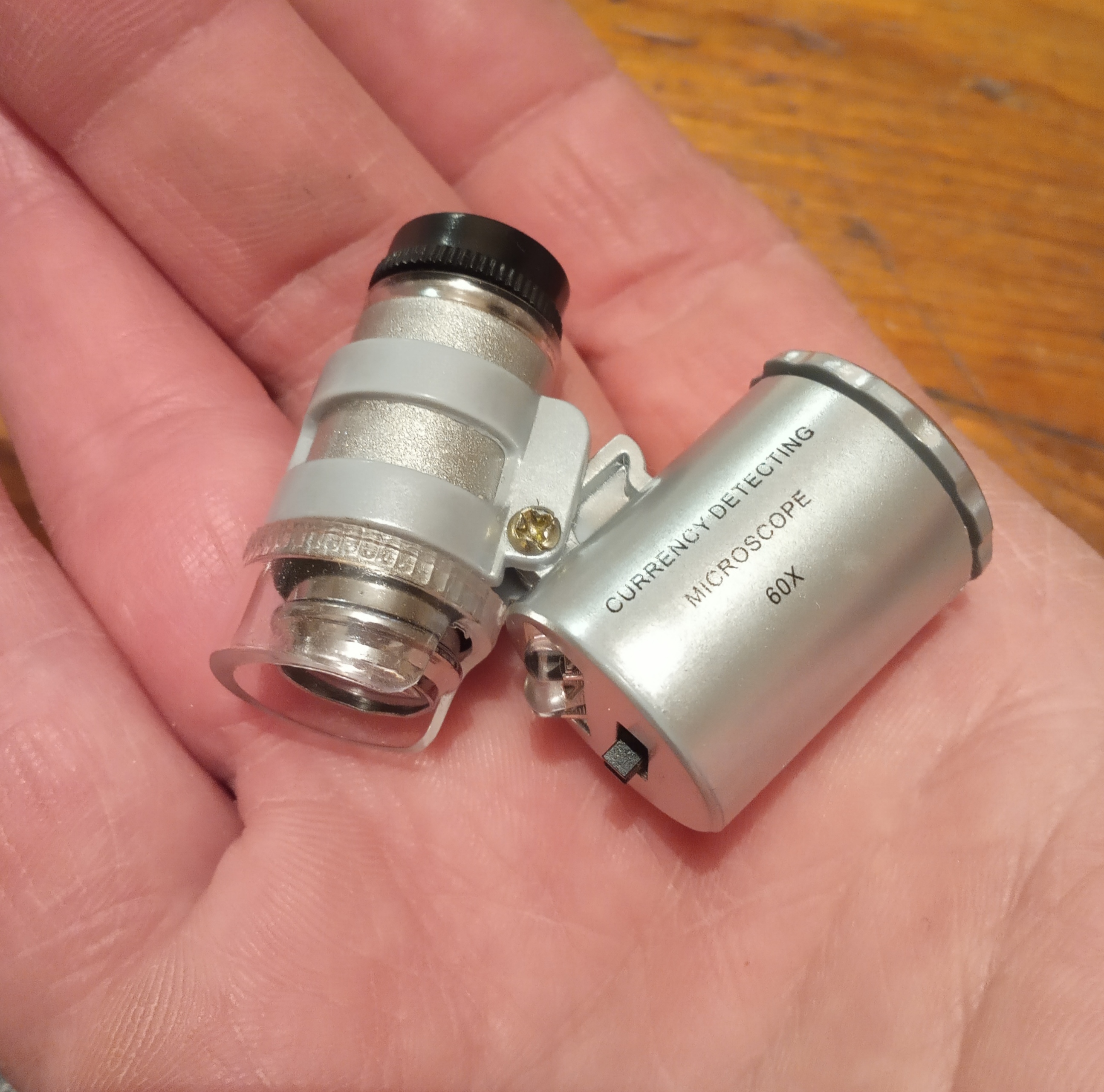 По сути такая лупка является маленьким микроскопом. На нем так и написано: MICROSCOPE.