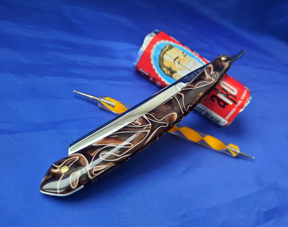 Ориентировочно - 50-60 годы, углеродистая сталь, ширина клинка - 6/8 дюйма, заклёпки - латунь. Вместо старой, хотя и годной оправы, была изготовлена новая, из американского киринита цвета "Desert Camo" от чего внешний вид бритвы только выиграл. Инструмент заточен на японских водных камнях, направлен, продезинфицирован и полностью готов к работе сразу после покупки, купил и брейся. Очень достойный вариант не только для новичка, но и для бывалого пользователя. Также всегда в продаже ремни для правки из натуральной полированной кожи растительного дубления и при покупке бритвы и ремня почтовые расходы по России за мой счёт. Начинающим подскажу и покажу, как пользоваться и ухаживать за инструментом. Цена - 8250 рублей.