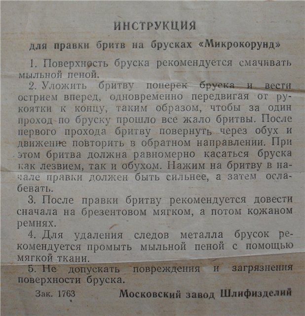 Re: RUGRAОтвечу так: соду отнеси на кухню, там она нужнее; масло-синтетику отнеси в гараж, там ему место; Теперь чисто совет: Купи на барахолке ржавую или не совсем Советскую бритву, попробуй привести её в порядок, если получится и руки не опустятся, то приступишь к Немецкой. Добрые люди еще рекомендуют почитать форум , там уже баян порвали про восстановление, заточку, правку и т.д и т.п.