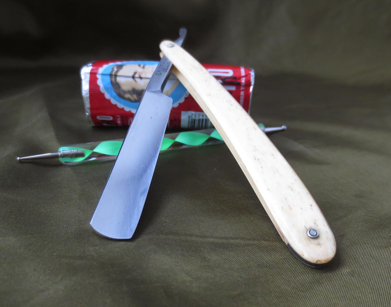 Ориентировочно - 50-60 годы, углеродистая сталь, ширина клинка - 6/8 дюйма, заклёпки - латунь. Вместо старой, хотя и годной оправы, была изготовлена новая, из американского киринита цвета "Desert Camo" от чего внешний вид бритвы только выиграл. Инструмент заточен на японских водных камнях, направлен, продезинфицирован и полностью готов к работе сразу после покупки, купил и брейся. Очень достойный вариант не только для новичка, но и для бывалого пользователя. Также всегда в продаже ремни для правки из натуральной полированной кожи растительного дубления и при покупке бритвы и ремня почтовые расходы по России за мой счёт. Начинающим подскажу и покажу, как пользоваться и ухаживать за инструментом. Цена - 8250 рублей.
