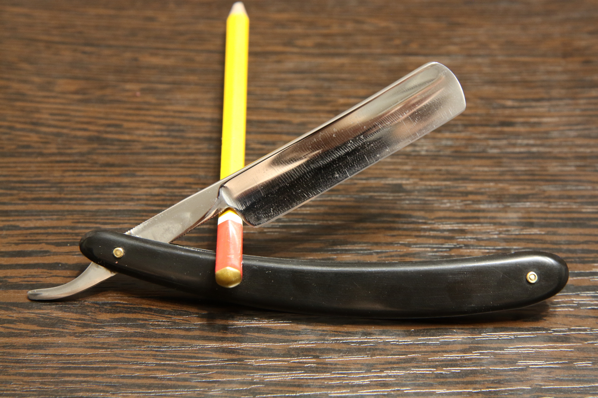 Опасная бритва Парикмахерская №1, завод ЗТВ (Вача), 1959 год. Ширина полотна 17.5 мм у пятки и до 16.7 у носа, все родное, футляр тоже. Пришла с некоторыми следами, бритву вручную почистил и заточил. Подготовлена мной к бритью. Модель Парикмахерская встречается очень редко, т.к. в свободной продаже их не было, поставлялись только в цирюльни. Сталь твердая, бреет несколько дубовато, но хорошо держит кромку. Цена - руб. К бритве рекомендую приобрести ремень для правки опасных бритв моего изготовления из итальянской кожи (подробнее на странице 4, объявления 56-58 и странице 9, объявления 127). Spoiler Show