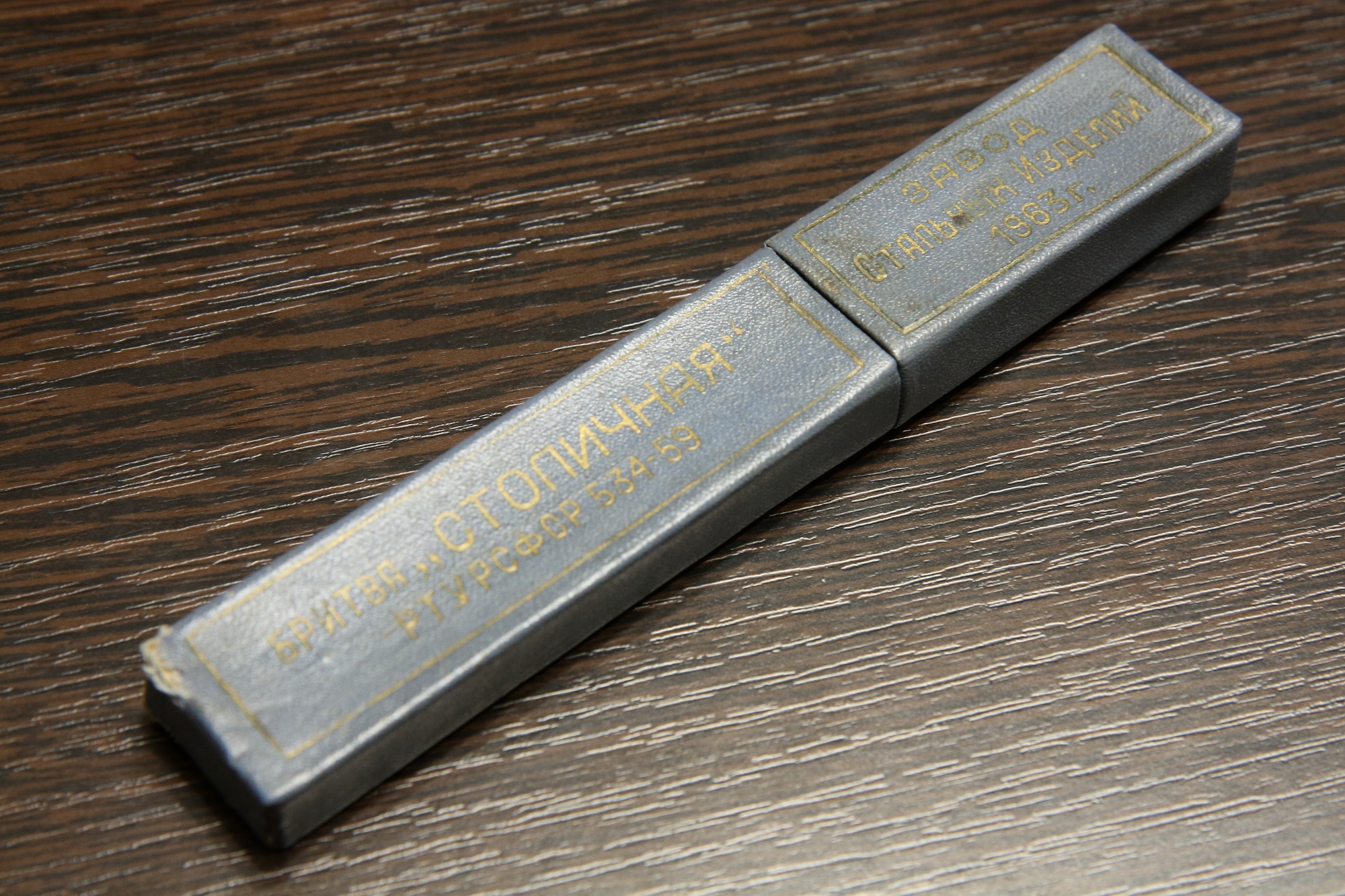 Опасная бритва Столичная, завод СТИЗ, 1960 год. Ширина полотна 16.7 мм, все родное, футляр без крышки от другой бритвы. Почистил вручную (остались некоторые следы времени) и подготовил к бритью. На лезвии было травление "Столичная с кремлевской стеной", но пришлось его удалить, т.к. оно было испорчено. Неплохая сталь и приятное дружеское бритье, сталь средней твердости, хорошо подойдет для начала. Цена - руб. К бритве рекомендую приобрести ремень для правки опасных бритв моего изготовления из итальянской кожи (подробнее на странице 4, объявления 56-58 и странице 9, объявления 127). Spoiler Show