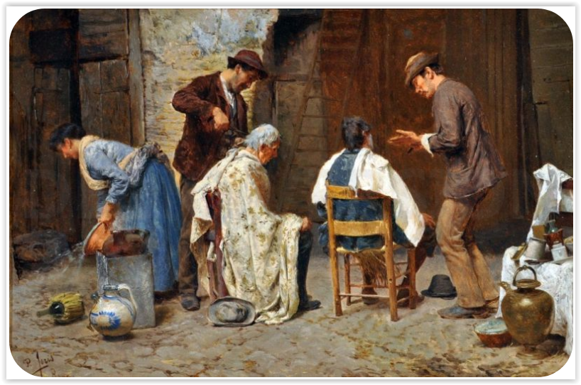 Albert Joseph Franke (1860–1924) Альберт Франке жил в Германии и Польше. Известен живописью на восточную тематику. „The barber's shop” „Цирюльня”, 1886 Pio Joris (1843-1921) Пио Йорис. Он родился в Риме. В 1870-х годах Йорис путешествовал по Европе. Его присутствие задокументировано в Лондоне, Париже и Испании. Он достиг пика своего успеха между 1880-ми и 1890-ми годами, завоевав многочисленные общественные награды за анекдотический стиль исторической живописи и приятные жанровые сцены. „'I barbieri di Roma” „Римские цирюльники” С 2013 г. с кайфом бреюсь опасной бритвой пять раз в неделю, в три прохода.