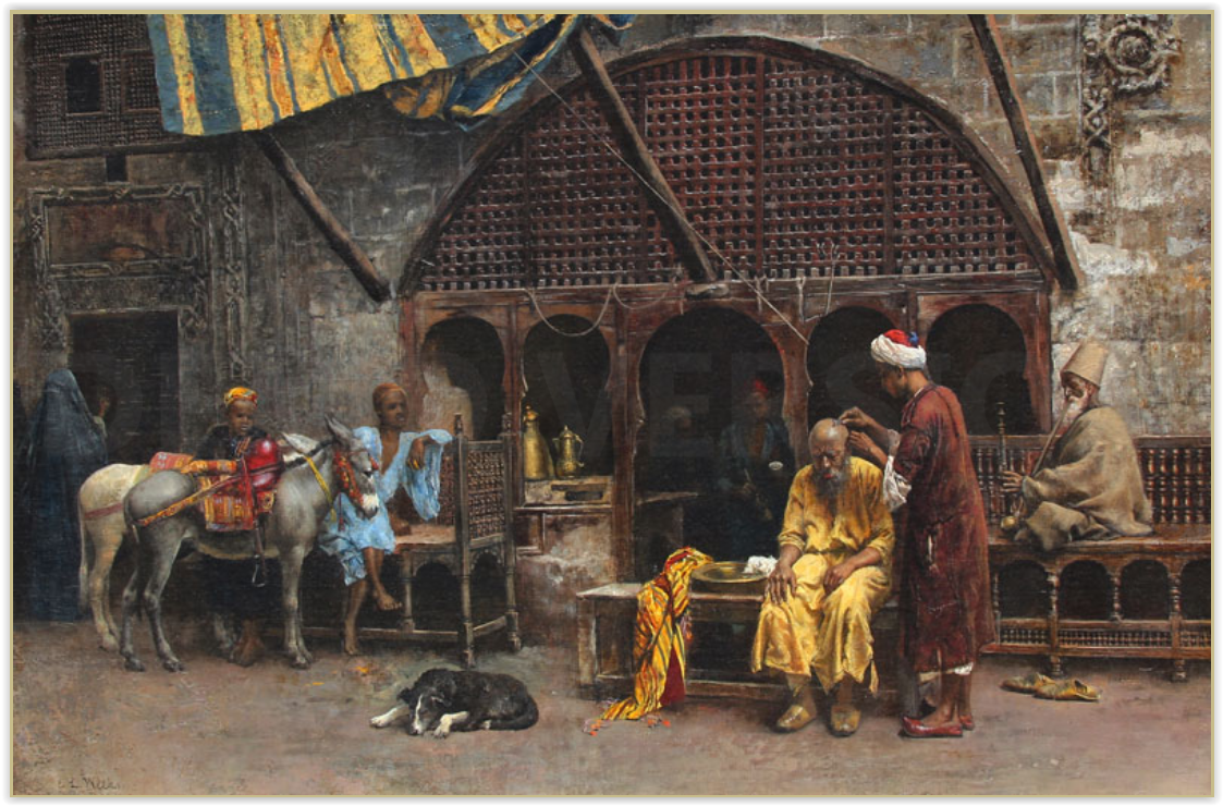 ''Rabbi in Barber Shop” "Раввин в парикмахерской”, около 1880 года Edwin Lord Weeks Эдвин Лорд Уикс 1849-1903 Уроженец Ньютонвилля, недалеко от Бостона, штат Массачусетс, художник, иллюстратор и писатель. „At the Barber’s” 1880 „У брадобрея” С 2013 г. с кайфом бреюсь опасной бритвой пять раз в неделю, в три прохода.