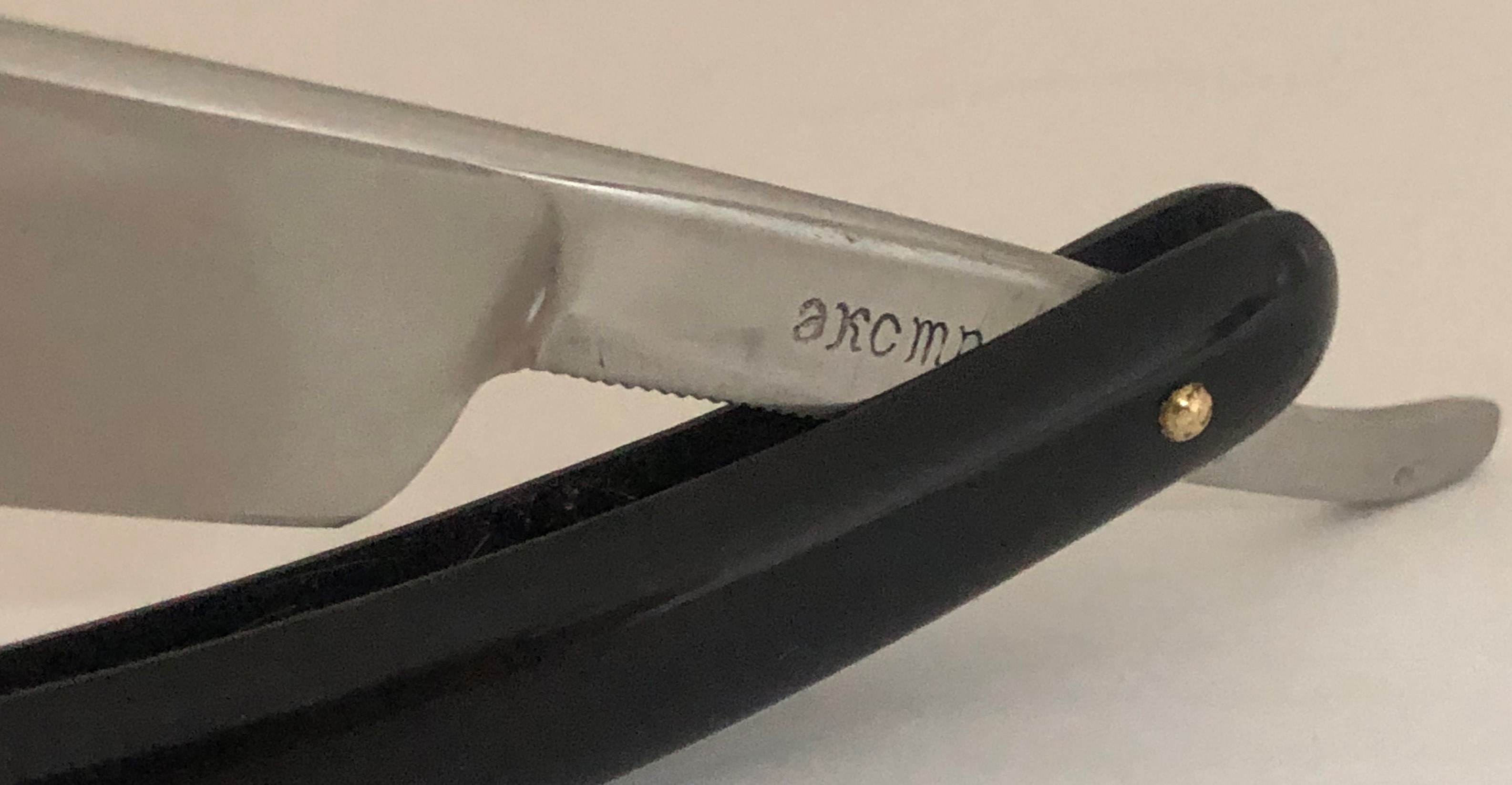 Углеродистая сталь.Про всей видимости 55 это год выпуска бритвы, хотя могу и ошибиться,но не намного.Бритва также без следов пользования.Ничего не разбиралось и не ремонтировалось. Все в оригинале.