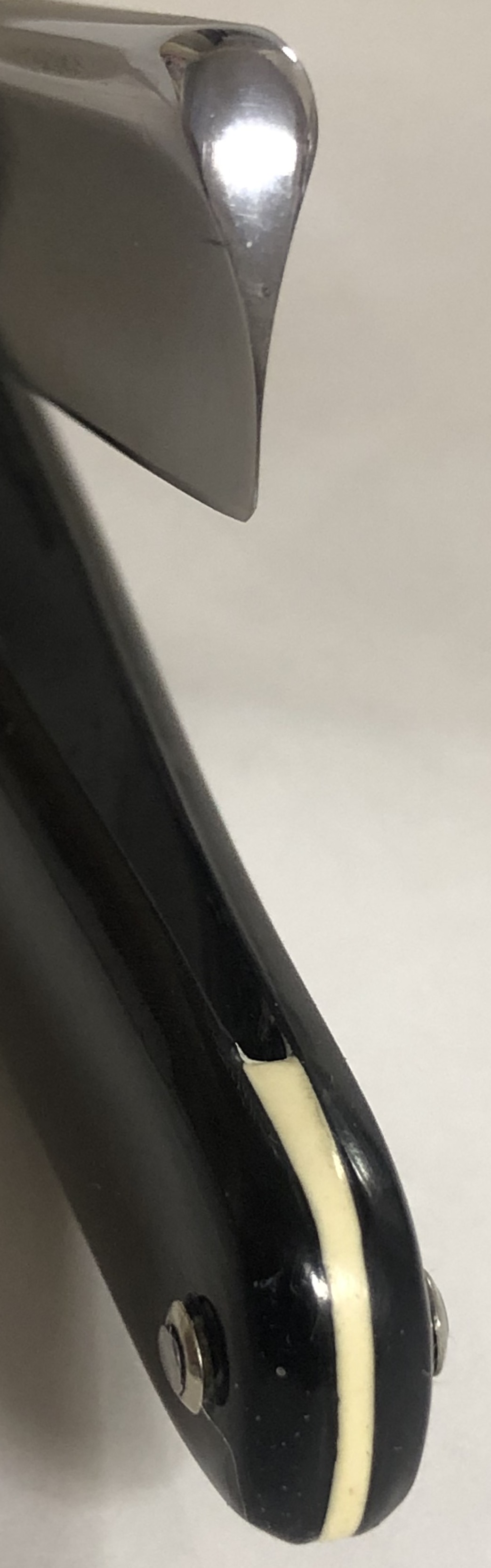 Бритва в очень хорошем состоянии,без признаков износа.Была разобрана, почищено полотно,удален скол и заново отполировано. Оригинальные пины сохранены и поставлены обратно.Кромочка равномерна по всей длине. Сталь чистая,без дефектов.Мощная и толстая пластиковая ручка. Бритва будет отличным вариантом для новичка, как по низкой стоимости, так и в плане удобства.Тяжелый клинок и ручка, вкупе с оригинальной формой лезвия и качественной сталью способны выдавать не только мягкое бритье, но и быть удобными в процессе освоения основ классического бритья.