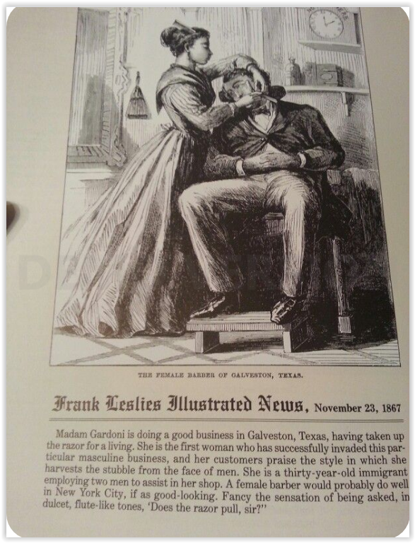 „Мадам Гардони ведет бизнес в Галвестоне, штат Техас, зарабатывая на жизнь бритвой. Она первая женщина, которая успешно вторглась в этот особый мужской бизнес и ее клиенты хвалят стиль, в котором она сбривает щетину с лица мужчин. Она - тридцатилетняя иммигрантка, нанимающая двух мужчин для работы в ее магазине. Женщина-цирюльник, вероятно, преуспела бы и в Нью-Йорке, если бы была такой же красивой. Представьте себе ощущение, когда вас спрашивают мягким флейтовым тоном: „Цепляет ли бритва, сэр?”