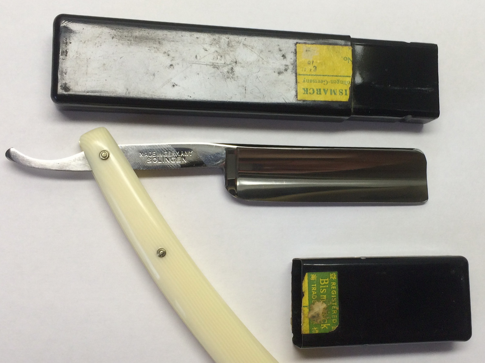 Название списать трудно ибо с французским не дружу. Так что Le MAIRE LE MATRE LEMAIRE LEMATRE В общем как то так Возраст бритвы лет 150 или 160 (мне так кажется Бритва отрегриндена. Ручка сделана из рога и полностью повторяет оригинальную ручку которая была в плачевном состоянии. Бритва заточена с одним слоем изоленты (так как у пяточки слишком узко и если точить без изоленты то там еще сузится а нам этого не надо) Ширина в самой широкой части 19 мм. Клинышек олово. Пины золинген Гринд грубоватый оставлен намеренно ибо 150-200 лет назад зеркало на такой переменной геометрии вряд ли было (зы немножко попортил гринд во время заточки - при заточке на 1000 ке протер воду вдоль полотна и оставил царапки, не кретично но предупредить должен) В общем красота. Цена 10,000 рублей