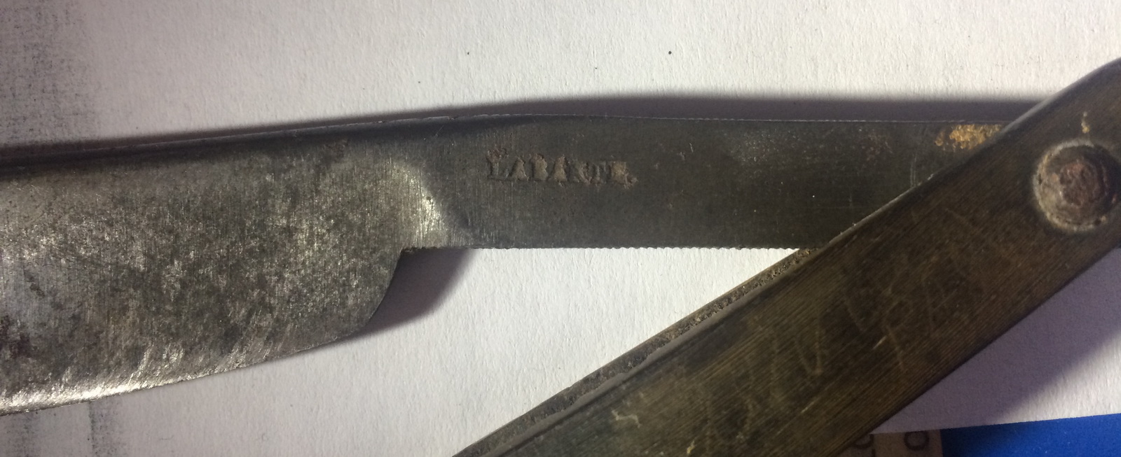 Название списать трудно ибо с французским не дружу. Так что Le MAIRE LE MATRE LEMAIRE LEMATRE В общем как то так Возраст бритвы лет 150 или 160 (мне так кажется Бритва отрегриндена. Ручка сделана из рога и полностью повторяет оригинальную ручку которая была в плачевном состоянии. Бритва заточена с одним слоем изоленты (так как у пяточки слишком узко и если точить без изоленты то там еще сузится а нам этого не надо) Ширина в самой широкой части 19 мм. Клинышек олово. Пины золинген Гринд грубоватый оставлен намеренно ибо 150-200 лет назад зеркало на такой переменной геометрии вряд ли было (зы немножко попортил гринд во время заточки - при заточке на 1000 ке протер воду вдоль полотна и оставил царапки, не кретично но предупредить должен) В общем красота. Цена 10,000 рублей