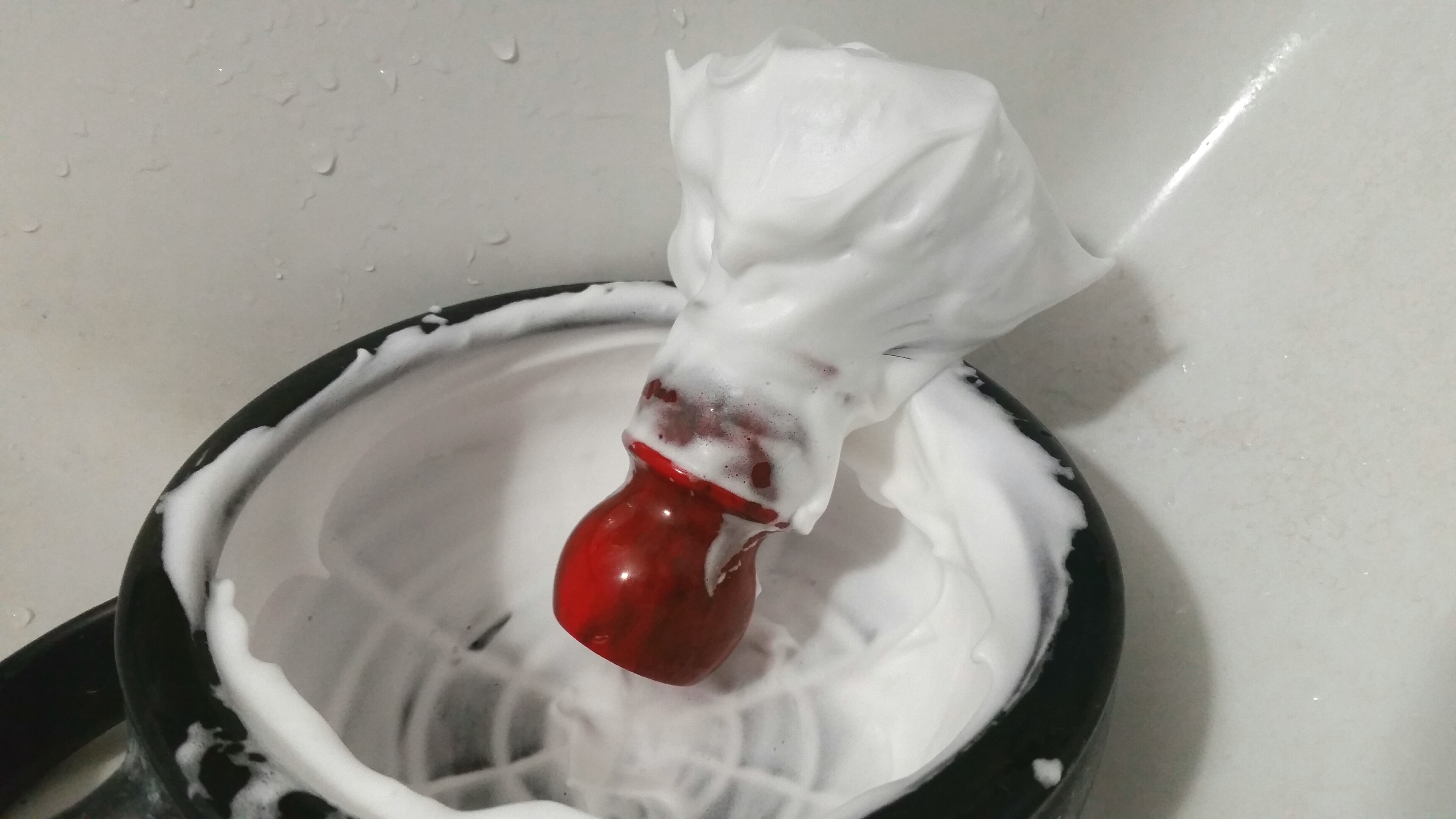 Мыло Ледяная вишня, деликатная база. Сейчас нахожусь в ожидании такого же, но на защитной базе, руки чесались, решил еще разок прогнать, мне все таки потом их сравнивать. Замачивал помазок в кипяченой воде, Маггард Тимбервольф, отличный пеногенератор. Хорошо стряхнул (по рекомендации производителя), забор делал долго, около 90 оборотов точно, узел визуально загрузился хорошо. Начал бить, на дне чаши воды не было (обычно начинаю, когда на дне воды чуть меньше чайной ложки), в таком режиме пеногенерации почти не было, подбавлял понемногу кипяченой в процессе, раз 5-6 точно. Дозировал аккуратно, чтобы вот не перелить))) Бил долго, минуты 3-4, оценил, что последующее добавление воды уже ничего не даст, поэтому закончил. Нанес на лицо, могу отметить очень хорошее скольжение, после первого прохода слегка умылся, скольжение остается, мыло в ноль не смывается, постскольжение есть, но как я отмечал и ранее - не гонюсь ни за скольжением, ни за пост. Область эспаньолки брею в конце прохода, на этом участке пена сильно деградировала - кожа очень значительно просвечивала, наносил повторно. Когда снимал пену клинком, она с полотна пыталась сползти, достаточно было махнуть бритвой и она слетала в раковину и шлепалась, обычно я смахиваю пальцем, на полотне пена стоИт, ее не смахнуть. Мыло не сушило, никаких побочных действий, 2 раза умылся в конце - смылось без проблем. Мыло просушил 1.5 часа, расход вышел между 2.5 и 3 граммами. Ментол приятно холодит, очень грамотно подобрано количество. Аромат приятный, как я ранее и отмечал. Не буду оценивать пену, оставлю фото на ваш суд, пена перед нанесением