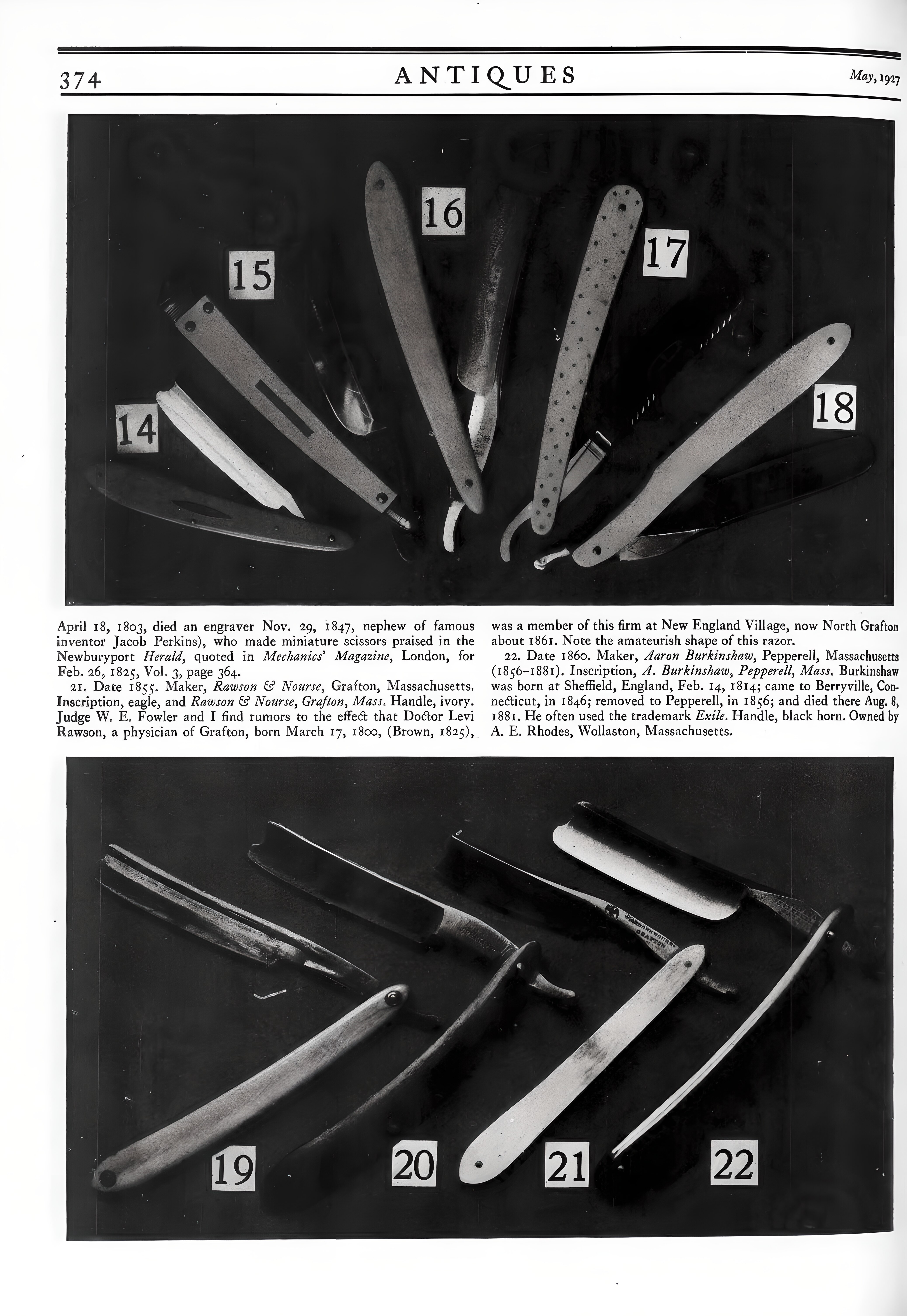 Во второй своей статье "More Old Razors", Henry T. Lummus представил и описал 22 бритвы из своей коллекции и коллекции своего коллеги - A. E. Rhodes, из города Wollaston, штат Массачусетс.