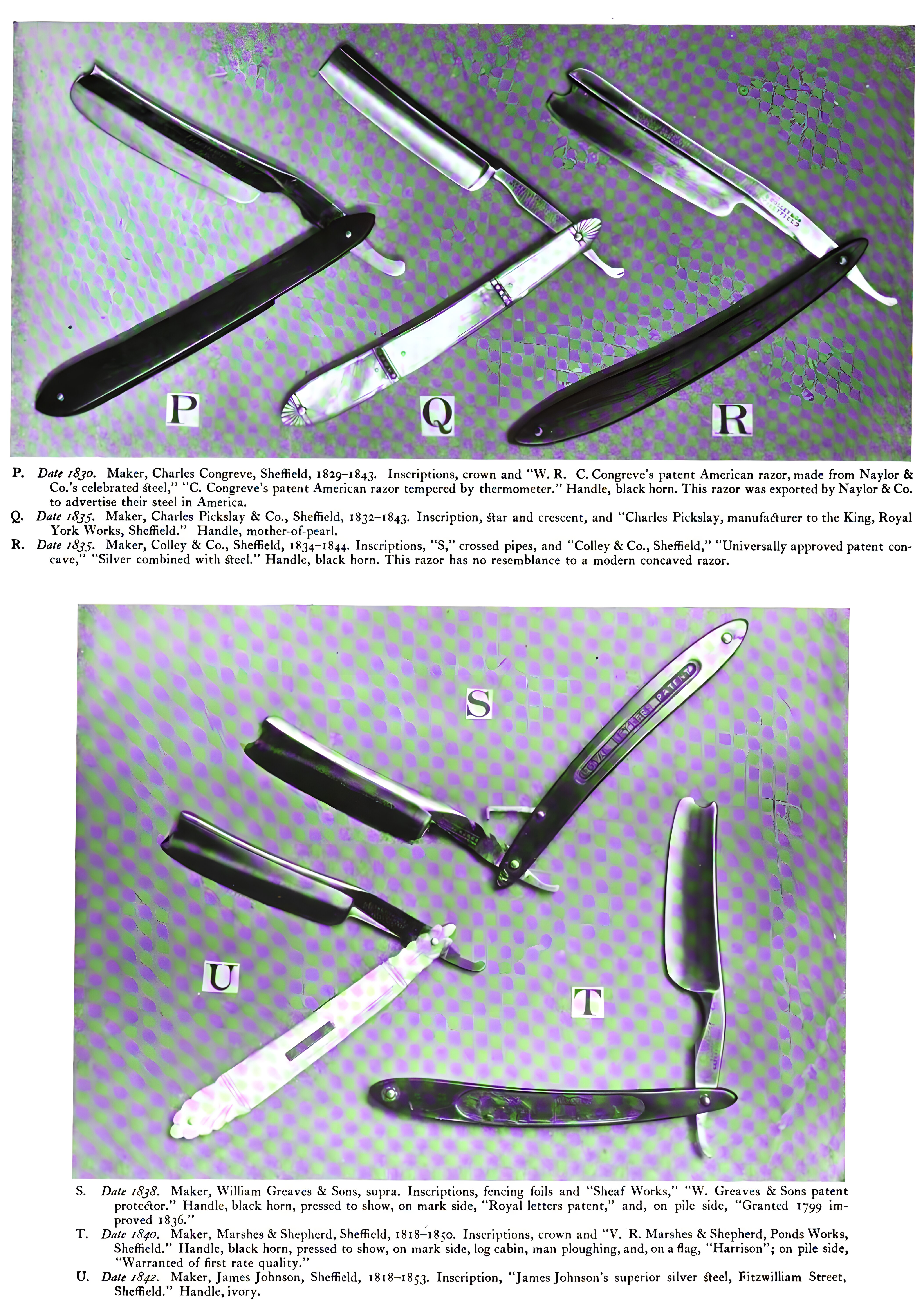 - P. Дата 1830 г. Производитель,Charles Congreve, Шеффилд, 1829–1843 гг. Надписи: корона и «W. R. Патентованная американская бритва C. Congreve, сделанная из знаменитой стали Naylor & Co.», « Патентованная американская бритва C. Congreve, закаленная c применением термометра». Ручка: черный рог. Эта бритва была экспортирована компанией Naylor & Co. для рекламы своей стали в Америке.