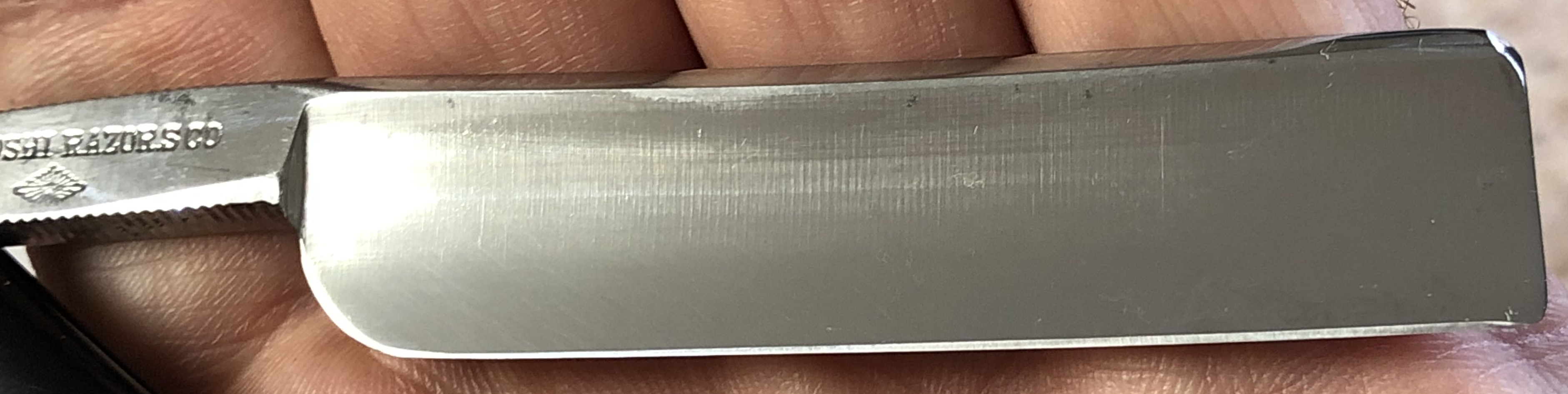 Бритва была разобрана, немного освежено полотно и умеренно отполировано,Пины поменял на немецкие втулки.Идеальная геометрия клинка:кромочка равномерна по всей длине. Сталь не твердая, что по идее должна выдавать достаточно мягкое и комфортное бритьё. Форма лезвия и размер бритвы мог бы очень хорошо подойти новичку.На мой субъективный взгляд, очень красивая бритва, с историей и в прекрасном состоянии. Заточена и готова к бритью.