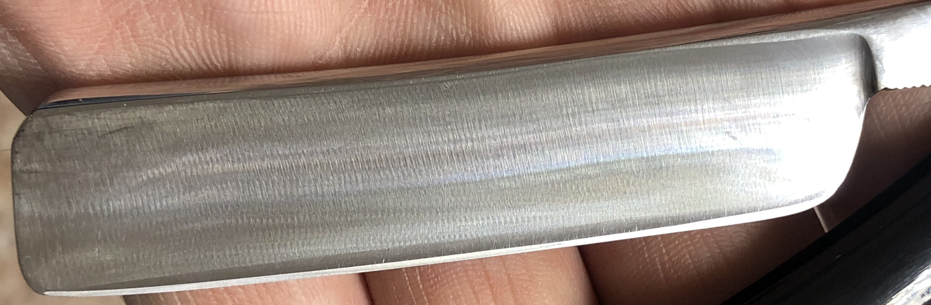 Бритва была разобрана, немного освежено полотно и умеренно отполировано,Пины поменял на немецкие втулки.Идеальная геометрия клинка:кромочка равномерна по всей длине. Сталь не твердая, что по идее должна выдавать достаточно мягкое и комфортное бритьё. Форма лезвия и размер бритвы мог бы очень хорошо подойти новичку.На мой субъективный взгляд, очень красивая бритва, с историей и в прекрасном состоянии. Заточена и готова к бритью.