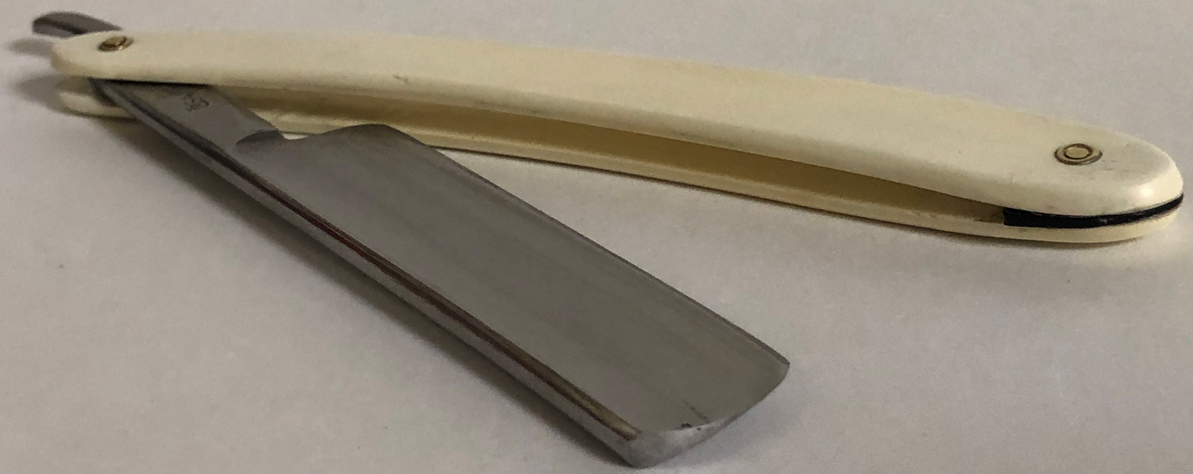 Бритва была разобрана, немного освежено полотно и умеренно отполировано,Пины поменял на немецкие втулки.Идеальная геометрия клинка:кромочка равномерна по всей длине. Сталь не твердая, что по идее должна выдавать достаточно мягкое и комфортное бритьё. Форма лезвия и размер бритвы мог бы очень хорошо подойти новичку.На мой субъективный взгляд, очень красивая бритва, с историей и в прекрасном состоянии. Заточена и готова к бритью.