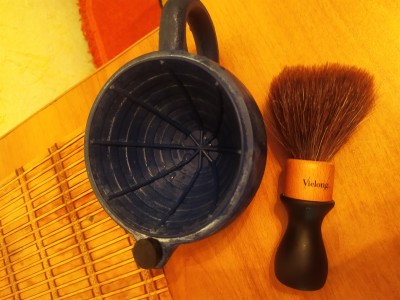 Сначало подчеркну, что внешний вид, материал и цвет меня совершенно не интересуют! Для меня главное качество кружка для бритья - это удобство! До этого я использовал фарфоровой чашки (слишком громоздкая, помазок из борсука) или миски для кошачего корма (слишком низкая, помазок из кабана). Несколько месяцев назад решил сделать чего-то более удобного. За копейки купил двух мисок из пищевого пластика. Высота - ок. 60 мм., ширина - 140 мм. Они тонкие и гибкие, поэтому я их приклеил друг к другу. В результате получилась крепкая двухстенная кружка с термоизолирующим эффектом. Весь - 68 грамм. Не бьется и не ломается - случайно пробовал несколько раз. Воду нагреваю в микроволновке. Подробно покажу. Внешний вид мисок: Перед приклеиванием подготовил поверхностей наждачной бумаги: Просверлил отверстие диаметром 1,5 мм в нижней миски: После приклеивания надо прижать и подождать несколько часов: Вот как выглядит с помазком из синтетики: Я очень доволен. Вот как работает: