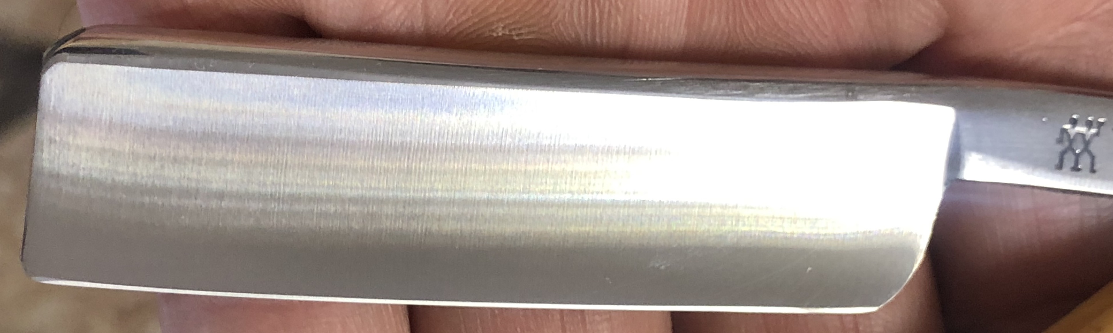 Клинок в пользовании не был.Единственно что,прошёлся тонким абразивом,дабы убрать немного окисления металла от времени.Попробовал воссоздать "родной"поперечный гринд.Идеальная геометрия полотна:кромочка равномерна по всей длине. Вместо сломанной оригинальной оправы поставил ручку от немецкого донора. Хорошая,добротная и ровная оправа.Небольшие трещинки намертво проклеены и никоим образом не повлияют на дальнейшую эксплуатацию.Немецкие двух-цветные пины, с добавлением внутренних шайб.Очень неплохой и недорогой рабочий инструмент, особенно для новичка.Заточена и готова к бритью.