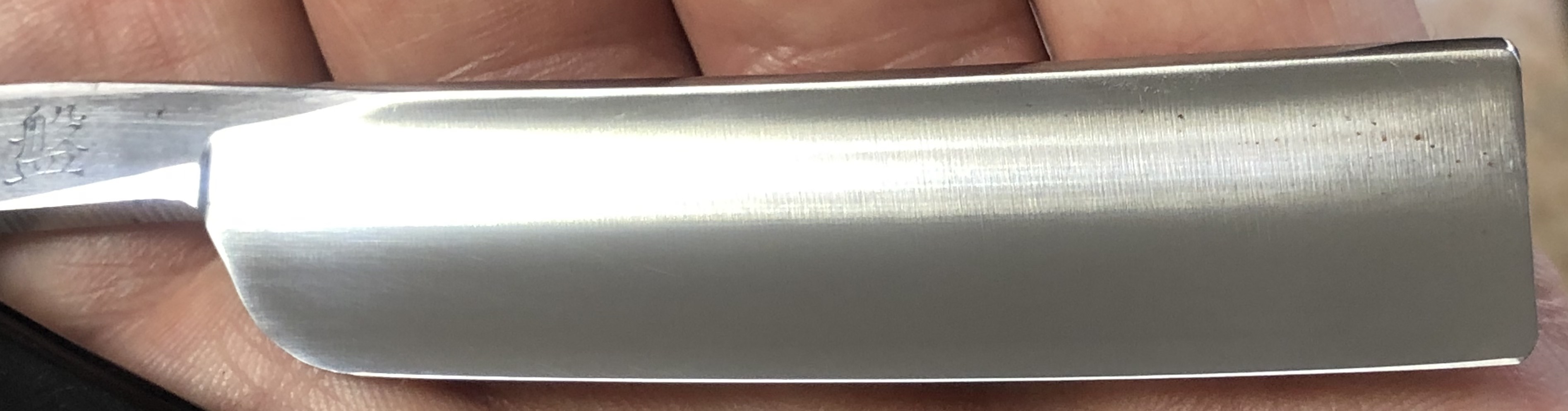 Бритва с немного неестественной формой лезвия именно для японцев."Горбатый"обушок , вкупе с тонким эрлем и средними размерами клинка смотрится очень даже неплохо.Бритву разобрал, почистил полотно и снова обрал, предварительно проклеив трещинку на ручке у нижнего пина.Сталь и кромка чистые от разного рода видимых дефектов.Идеальная геометрия клинка. Кромочка равномерна по всей длине.Удобная, вёрткая, с отличной сталью бюджетная бритва. Заточена и готова к бритью.