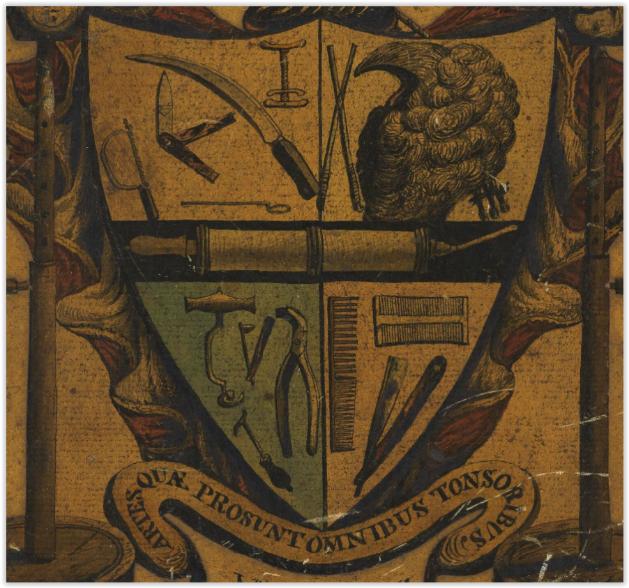 - под гербом девиз „Artes quæ prosunt omnibus tonsoribus Londini” - „Искусство, приносящее пользу всем лондонским парикмахерам”.