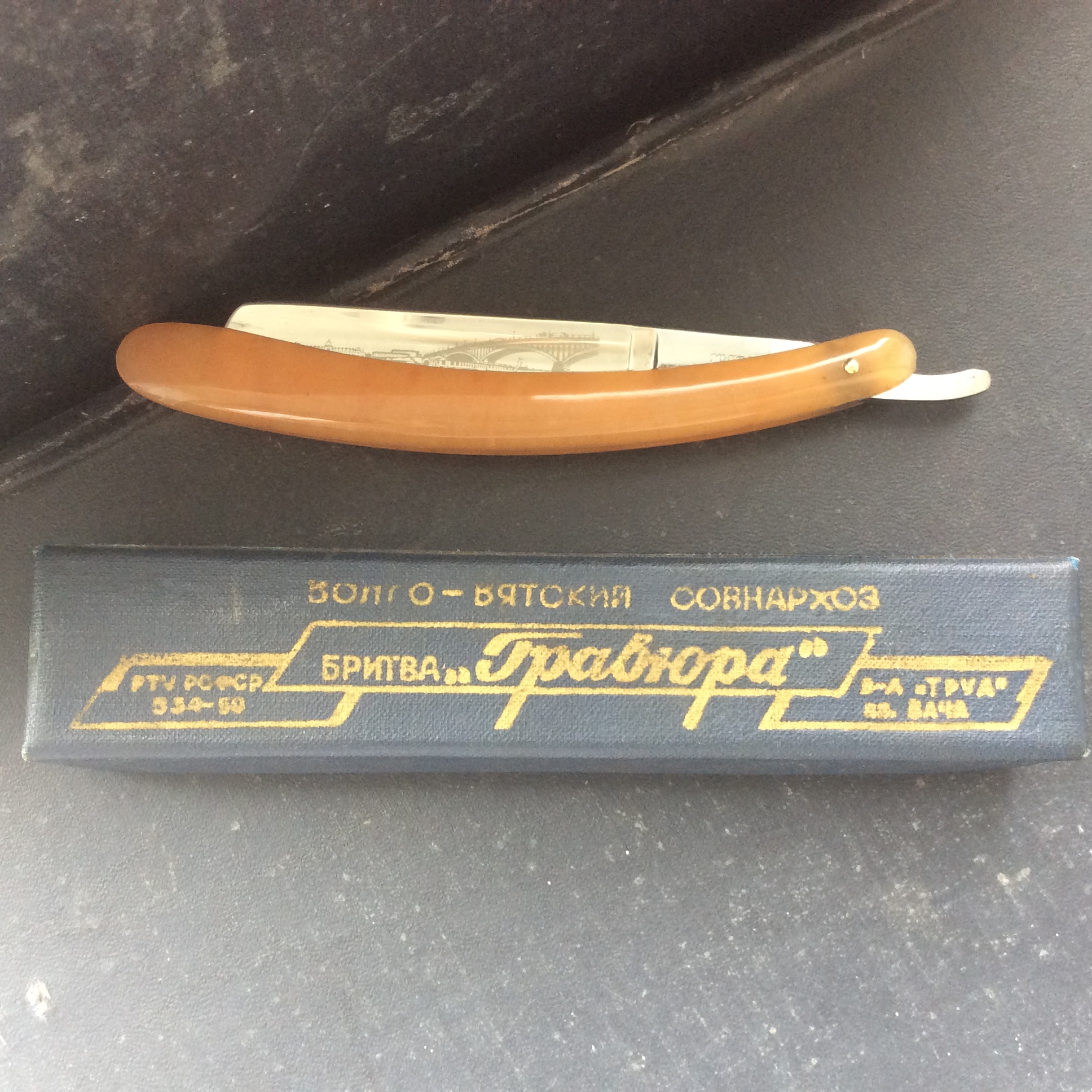Самая "взрослая" бритва ориентировочно 1932-1934 года производства, с футляром, но без крышечки. С заводской заточкой, но со следами неправильного хранения.