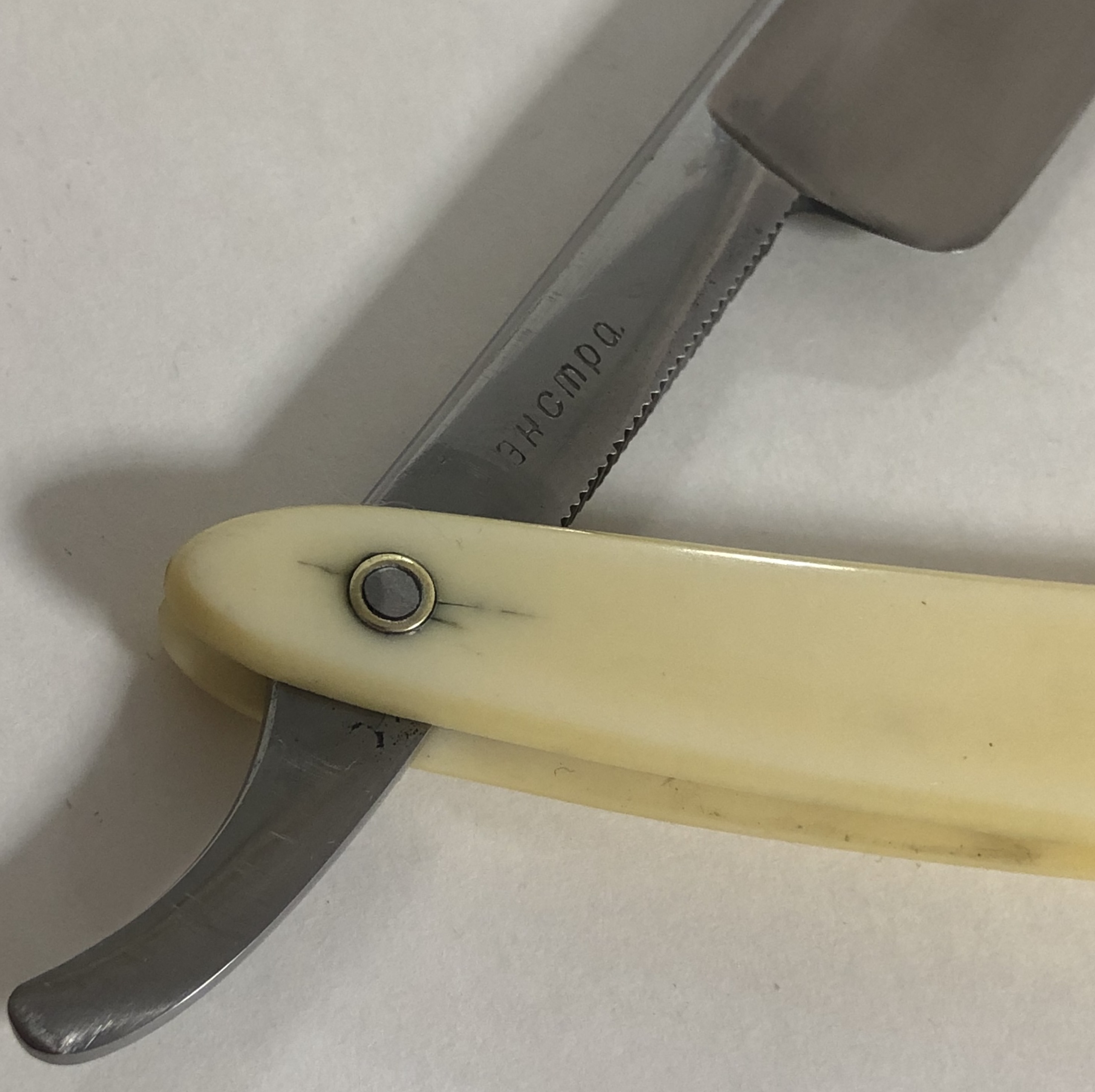 Бритва в очень хорошем состоянии. Не разбиралась. На самых тонких абразивах совсем немного освежил полотно от патины и небольших царапин и все.Идеальная геометрия клинка:кромочка равномерна по всей длине и практически незаметна.