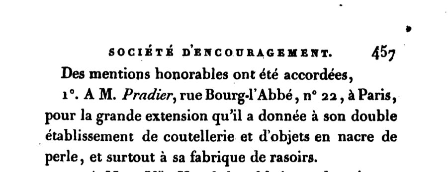 Jean Le Page, Bladies №22 Rue Bourg L'Abbé ParisПроизводитель: Pradier №22 Rue Bourg L'Abbé Paris http://coupechouclub.cultureforum.net/t ... abbe-paris http://straightrazorplace.com/razor-clu ... ost1222547 Искал по названию улицы бритву и нашел у нас ошибочное название производителя. Вот ссылка на книгу архив производителей 1822 года 457 страница выложена выше Кстати там ниже в похожих книгах выложены архивные книги и за другие года и там их около 40. Возможно там найдутся и все производители бритв из Франции. Spoiler Show