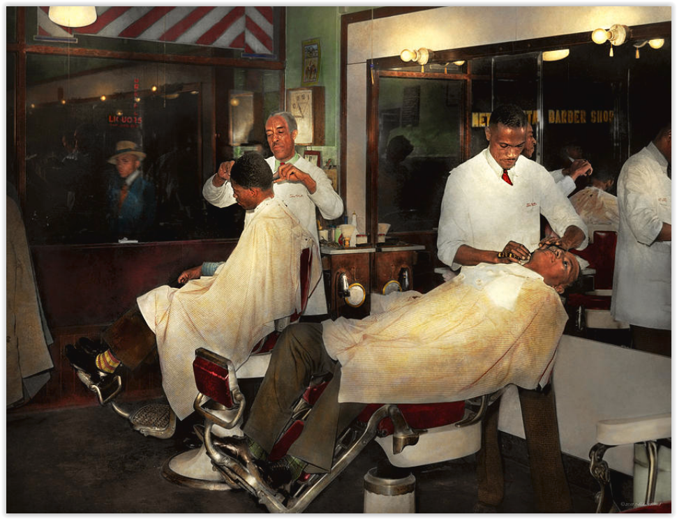 „Barbershop” „Барбершоп” Ernest Eugene Barnes Jr. (1938-2009) Эрнест Юджин Барнс-младший стал первым американским профессиональным спортсменом, который стал известным художником. В поп-культуре картины Барнса появляются на обложках музыкальных альбомов, на телевидении и в фильмах. „Palace Barber Shop” „Дворцовая парикмахерская” Взглянем поближе: Sahib Goswami (Сахиб Госвами) - современный индийский художник из Пуны. „Вarber shop” „Цирюльня” Взглянем поближе, бритва рядом с ножницами:
