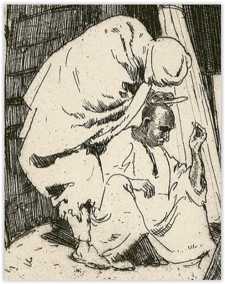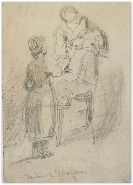 „Barber in Mayence” „Парикмахер в Майнце” 1858 г. На первом взгляде - простой ескиз карандашом, а все „поймал”! Взглянем поближе: Прошу прощения, но не могу удержатся и покажу любопытный факт насчет этого художника. Картина Джеймса Уистлера „Whistler's Mother” („Мать Уистлера”) показана в фильме „Мистер Бин”: