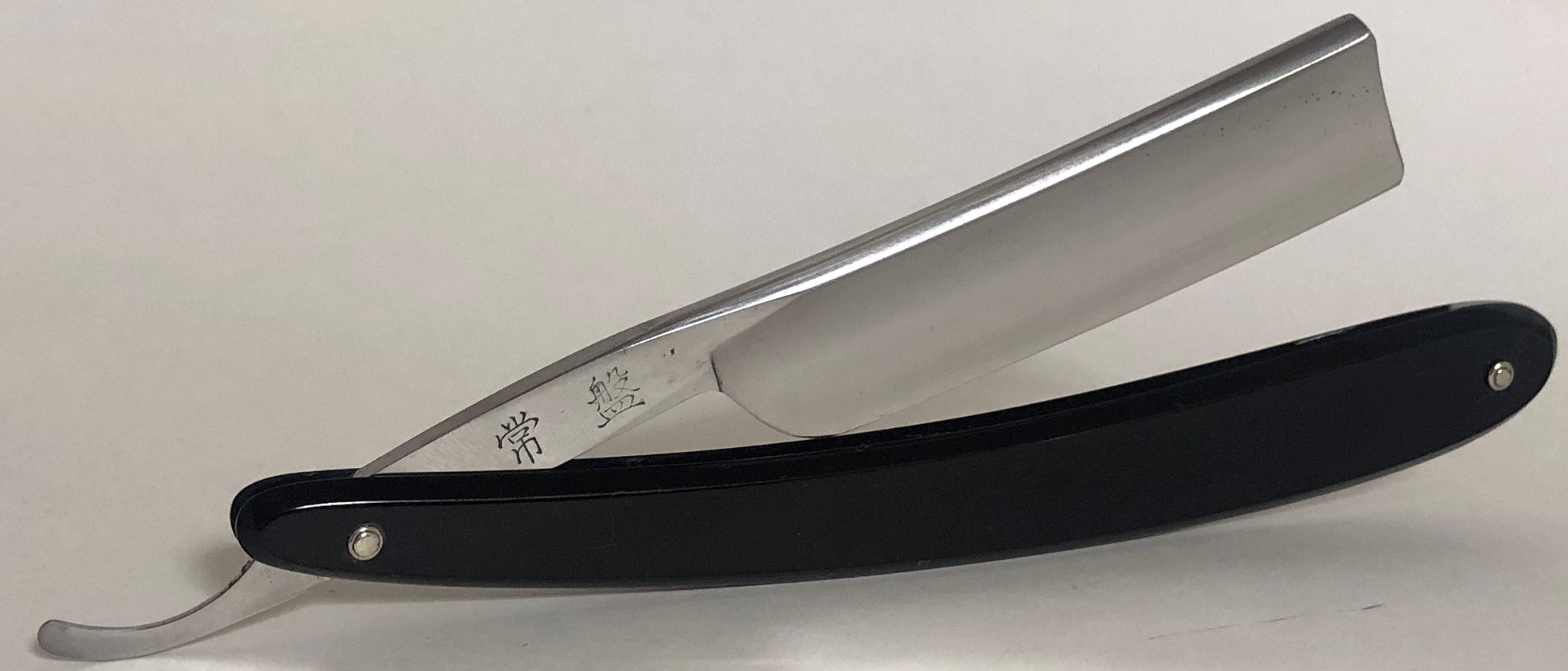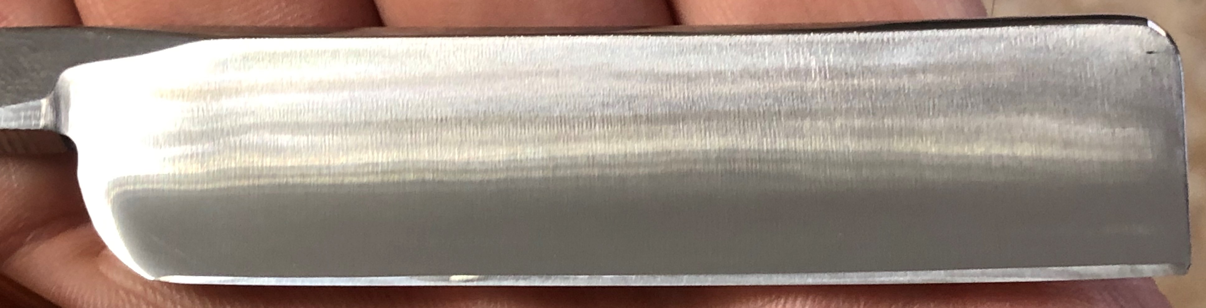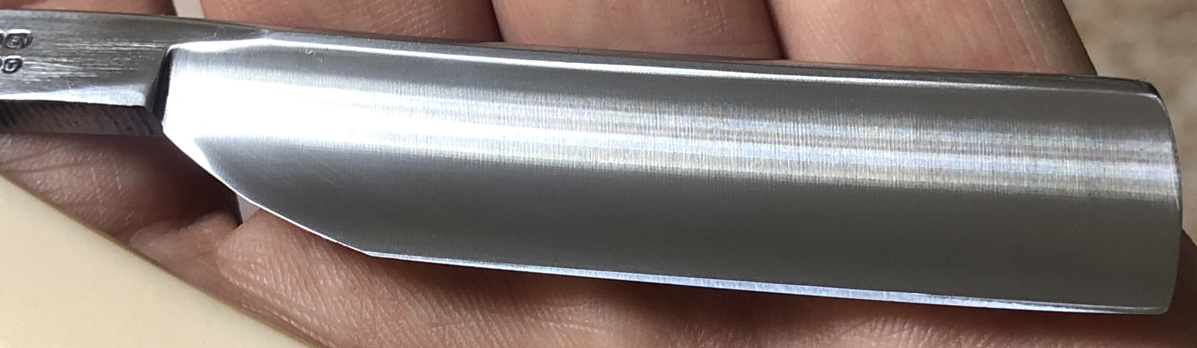 Бритва с немного неестественной формой лезвия именно для японцев."Горбатый"обушок , вкупе с тонким эрлем и средними размерами клинка смотрится очень даже неплохо.Бритву разобрал, почистил полотно и снова обрал, предварительно проклеив трещинку на ручке у нижнего пина.Сталь и кромка чистые от разного рода видимых дефектов.Идеальная геометрия клинка. Кромочка равномерна по всей длине.Удобная, вёрткая, с отличной сталью бюджетная бритва. Заточена и готова к бритью.