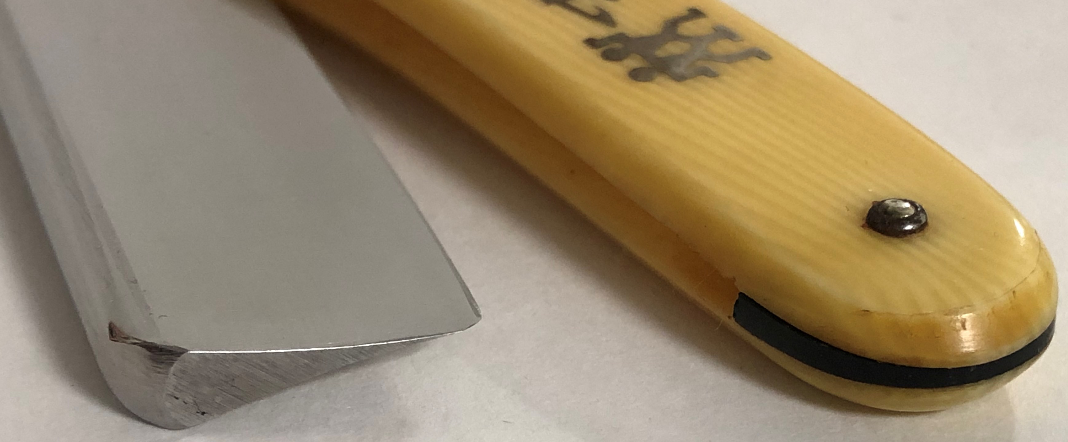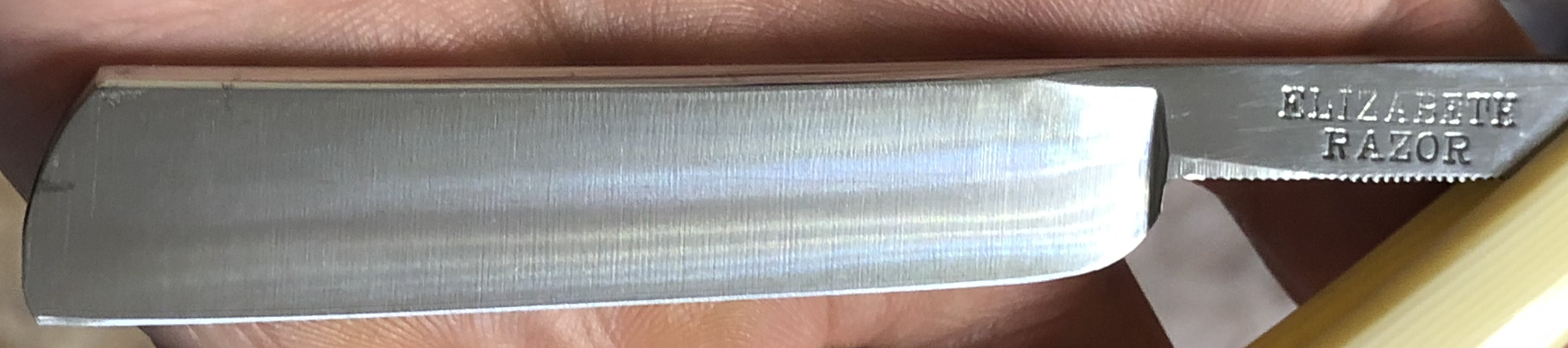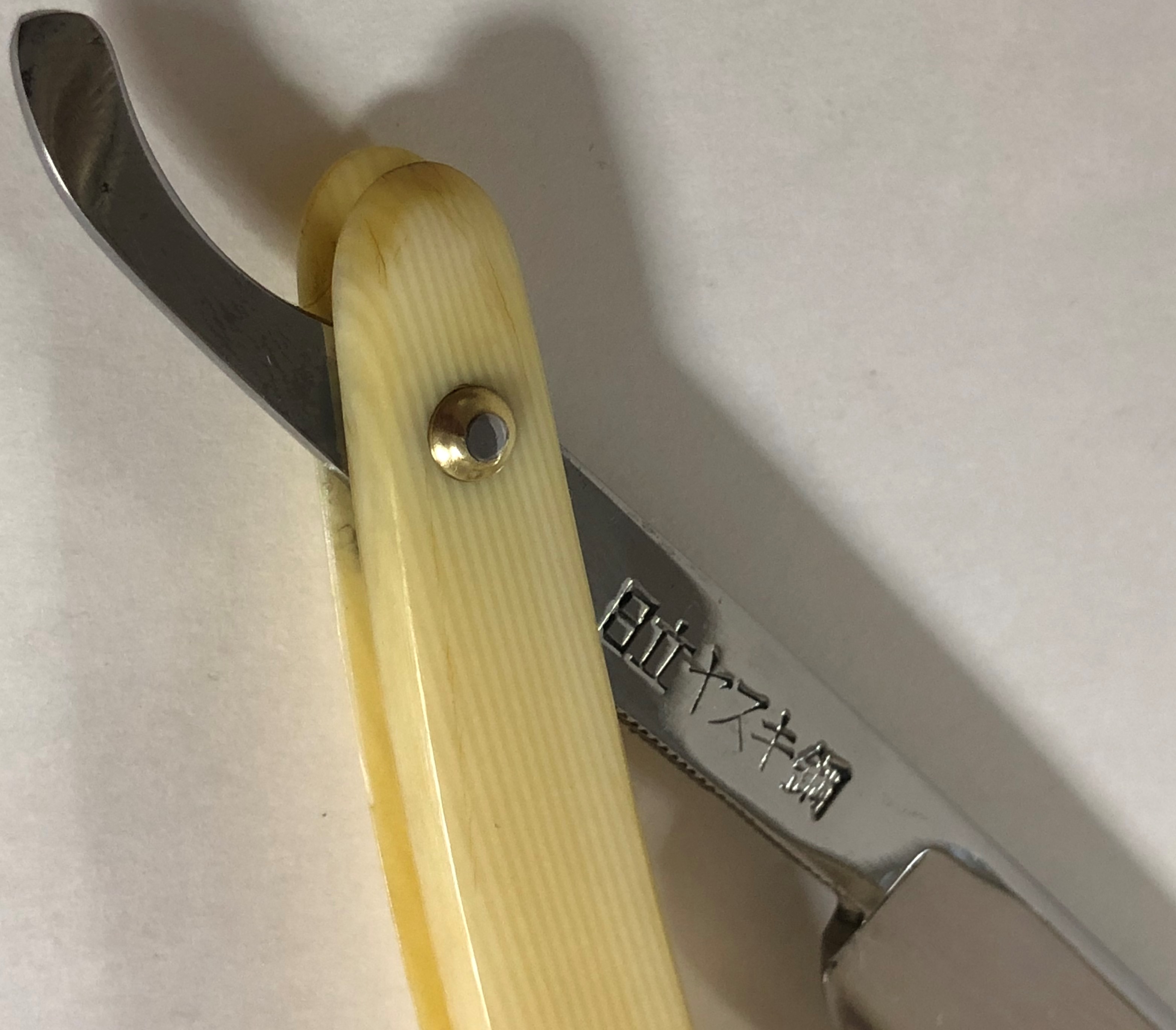 Бритва с немного неестественной формой лезвия именно для японцев."Горбатый"обушок , вкупе с тонким эрлем и средними размерами клинка смотрится очень даже неплохо.Бритву разобрал, почистил полотно и снова обрал, предварительно проклеив трещинку на ручке у нижнего пина.Сталь и кромка чистые от разного рода видимых дефектов.Идеальная геометрия клинка. Кромочка равномерна по всей длине.Удобная, вёрткая, с отличной сталью бюджетная бритва. Заточена и готова к бритью.