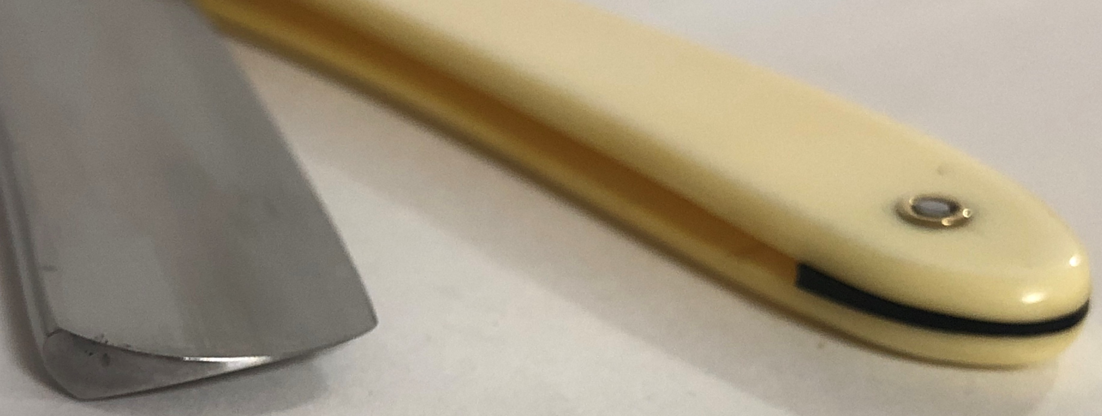 Достаточно не часто встречающаяся форма лезвия, с экстра полной вогнутостью.следов пользования не заметил.Разобрал, немного освежил металл и снова собрал.Идеальная геометрия полотна.Шведская сталь на клинке, как одна из самых удачных.Металл чистый от разного рода видимых дефектов.Отличная парикмахерская бритва, для профессионального использования, способная выдавать очень качественное и чистое бритьё.