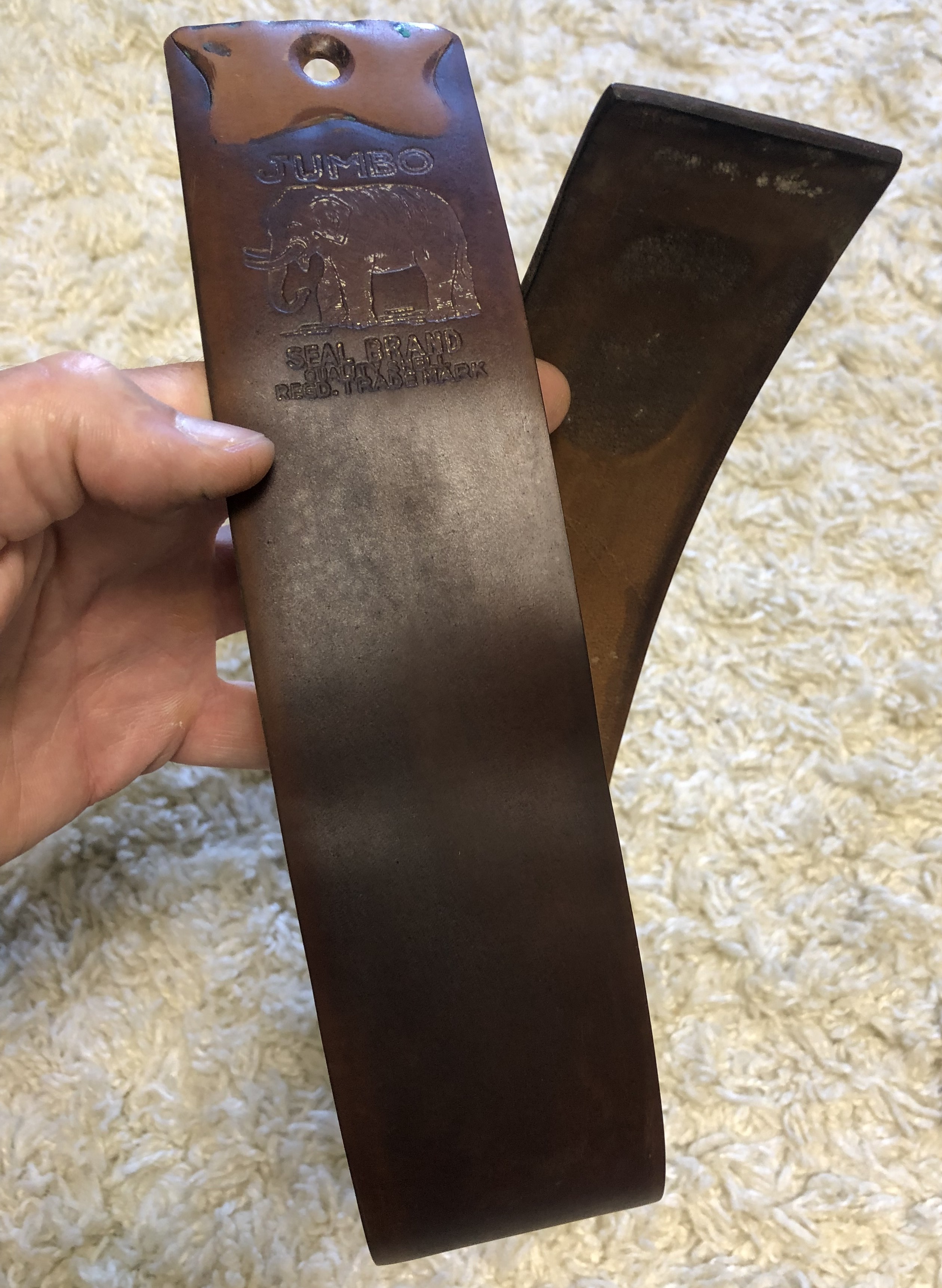 Специально ничего не делал с кожей, чтобы было видно исходное состояние лошади.Немного суховат,жестковат, хотя эластичность сохранилась. Есть микротрещинки на обратной стороне кожи. Сам кордован в хорошем состоянии,без порезов, шрамов, заломов и др.Требуется шлифовка и пропитка костным маслом. После реставрации можно использовать в качестве подвесного ремня, либо , что ещё лучше, в качестве колодочного или натяжного.