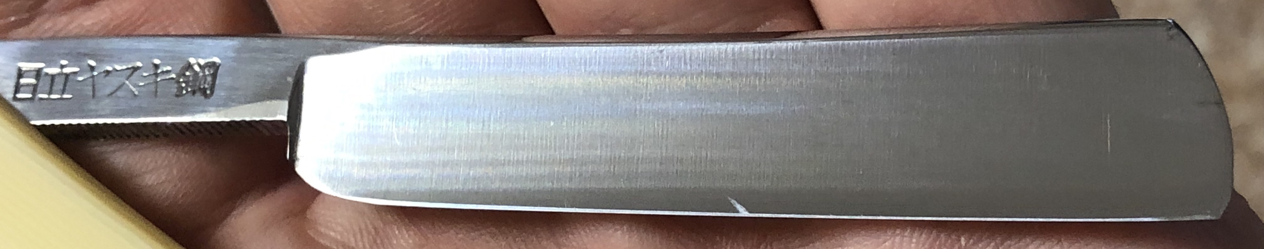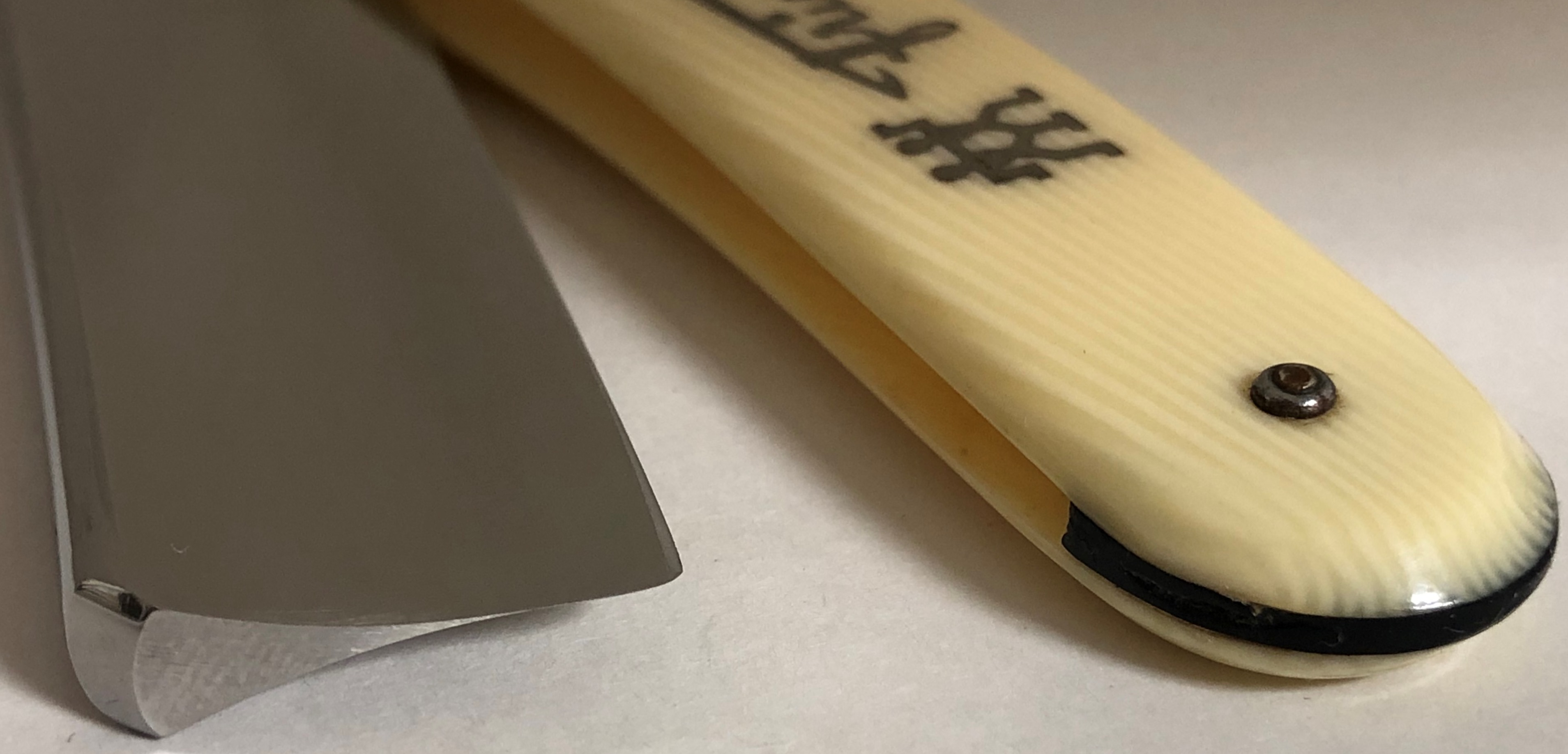 Бритва с немного неестественной формой лезвия именно для японцев."Горбатый"обушок , вкупе с тонким эрлем и средними размерами клинка смотрится очень даже неплохо.Бритву разобрал, почистил полотно и снова обрал, предварительно проклеив трещинку на ручке у нижнего пина.Сталь и кромка чистые от разного рода видимых дефектов.Идеальная геометрия клинка. Кромочка равномерна по всей длине.Удобная, вёрткая, с отличной сталью бюджетная бритва. Заточена и готова к бритью.
