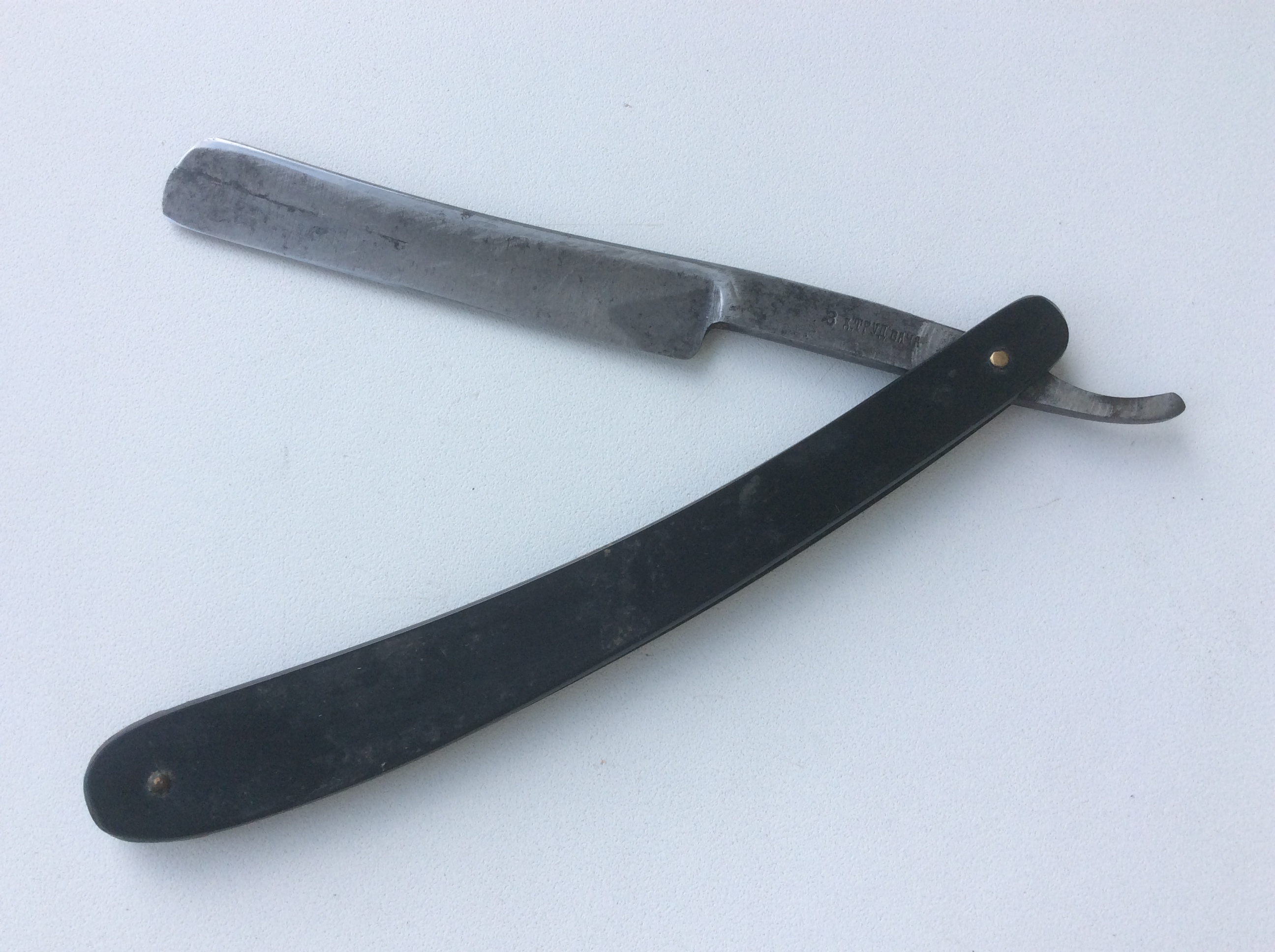 Старая француженка. Была совсем печальная. Глубокие раковины на клинке и эрле. Протер тряпочкой. Следы времени конечно остались, но результат всё же положительный. Сегодня побрился ею. Бреет отлично. Всё таки старая сталь. Spoiler Show 32 года активно мусолю харю клинковой бритвой