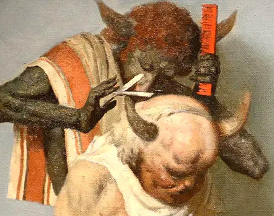 Carlo Bugatti (1856-1940) Карло Бугатти был итальянским художником, декоратором, дизайнером и производителем мебели в стиле модерн, моделей ювелирных украшений и музыкальных инструментов. Он написал подобную картину: „The Barbershop” „Цирюльня” Взглянем поближе: С 2013 г. с кайфом бреюсь опасной бритвой пять раз в неделю, в три прохода.