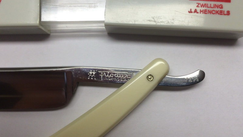Zwilling J.A. Henckels AG, Solingen 6/8 Модель 72 1/2 Friodur Inox No stain Germany Нержавейка с обработкой жидким азотом. Мягкая. Подойдет новичкам. Хорошо пойдет под борд с пастой. Состояние идеальное (не могу написать что NOS так как не я вскрывал) Но даже ветхая бумажка на месте. Сложно оценить возраст. Лэйбл говорит что моложе 80 лет. Бумажка истлела как на все 60-80 лет (трухлявая и с запахом библиотеки) Но пластиковая коробочка смущает. (как сейчас помню что году этак в 2000 видел такие в магазинах и слюни пускал. Но ручки у бритв были уже более грубые. Так что по факту думаю годов 90-х а м.б. и 80-х Цена 9000