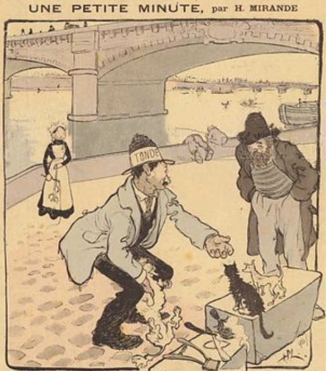„Bruler Voltaire!!!..” „Сжечь Вольтера !!! …”, политическая сатира, 1827 г. На улице сжигают книги; цирюлюник выражает свое возмущение по поводу сожжения книг Вольтера: С 2013 г. с кайфом бреюсь опасной бритвой пять раз в неделю, в три прохода.